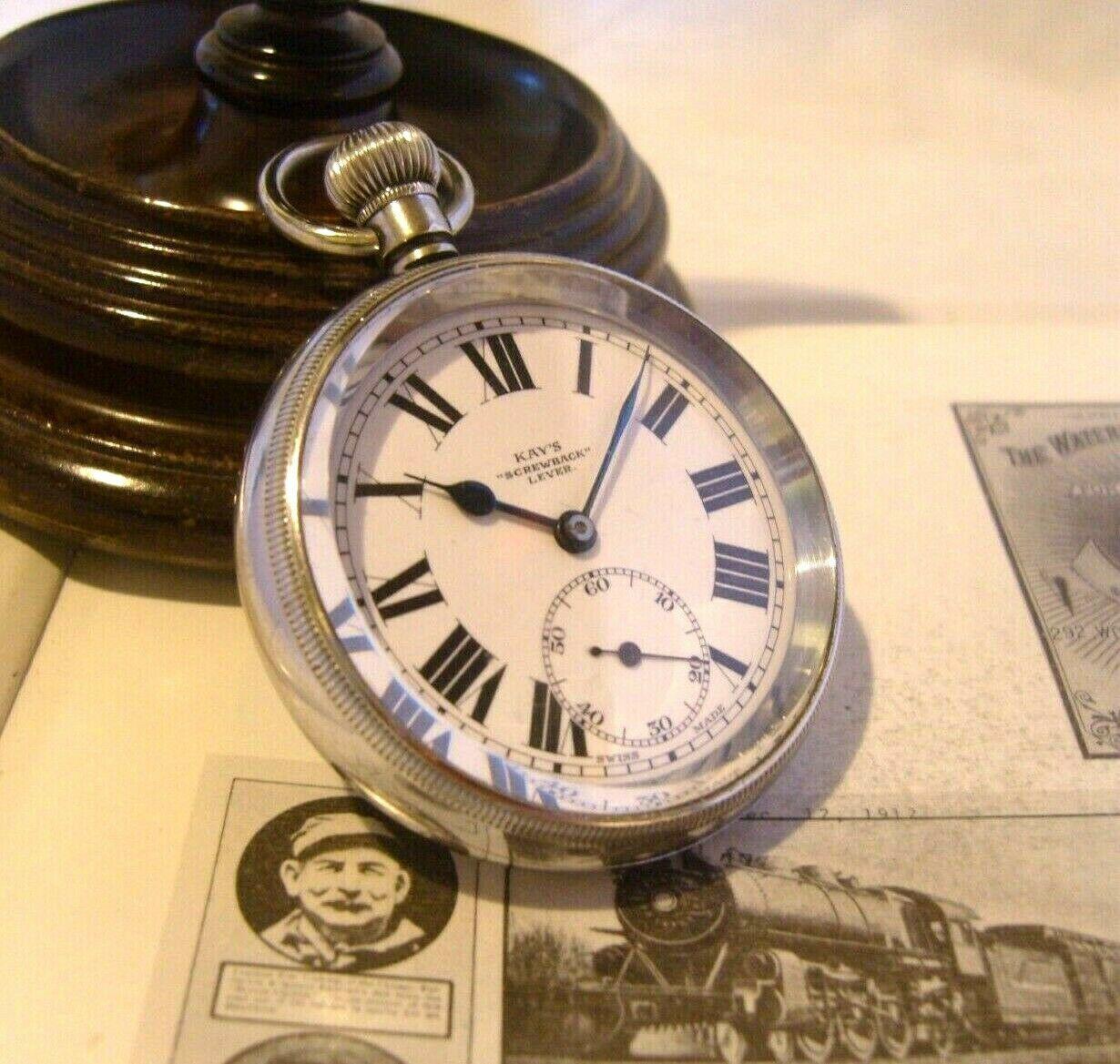 Antique Pocket Watch 1920s Kay's Railway Type 15 Jewel Chunky Chrome Case FWO