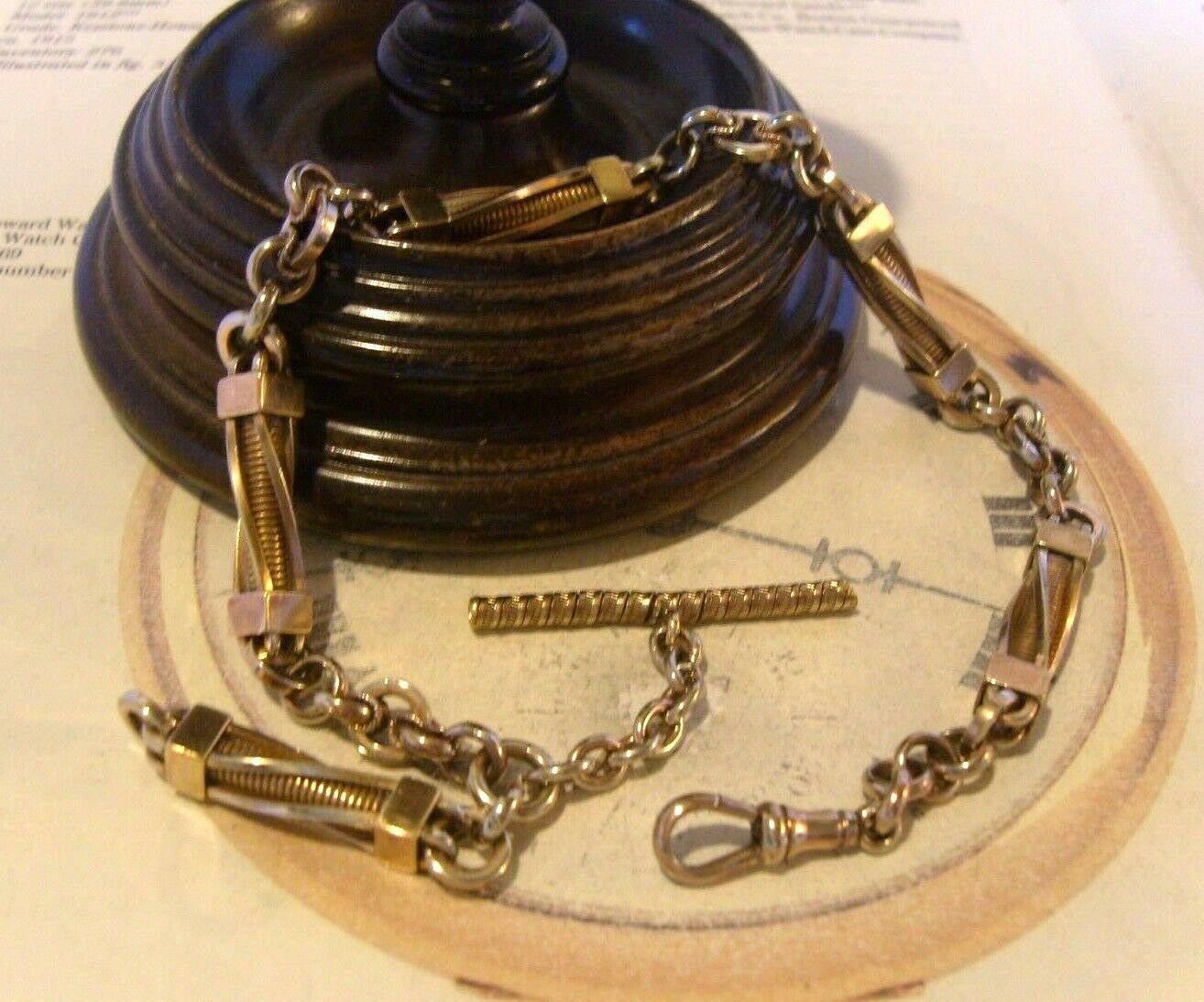 Antique Pocket Watch Chain 1890s Victorian Big Rose Gilt Albert With Fancy T Bar