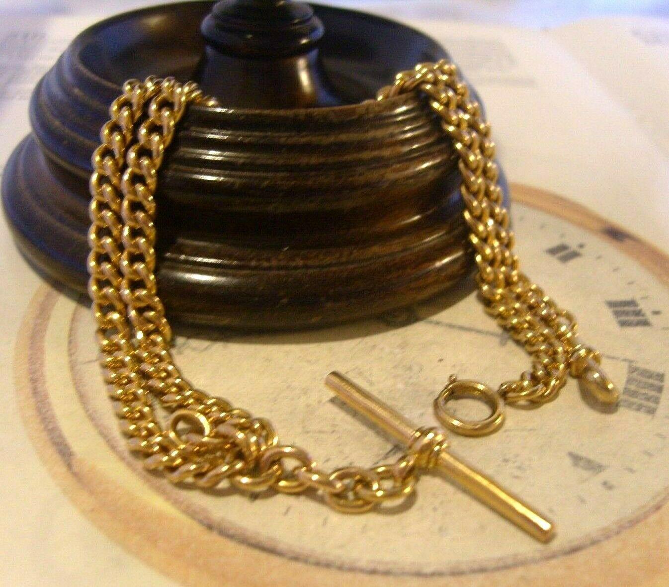 Antique Pocket Watch Chain 1890s Victorian Large 14ct Yellow Gold Filled Albert With T Bar