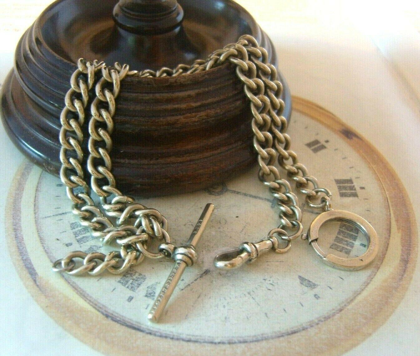 Antique Pocket Watch Chain 1890s Victorian Large Regent Silver Albert With T Bar