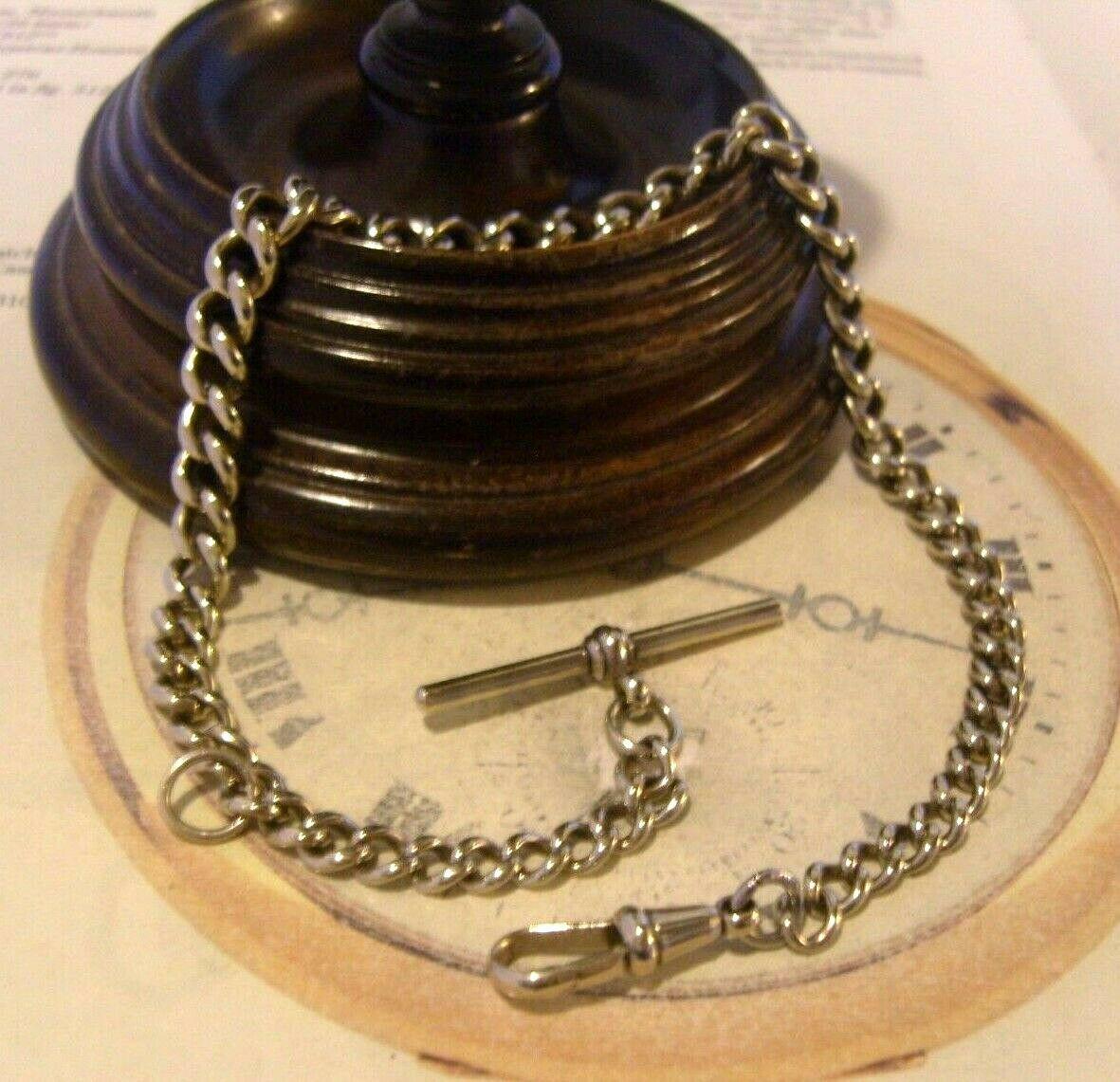 Antique Pocket Watch Chain 1890s Victorian Large Silver Nickel Albert With T Bar