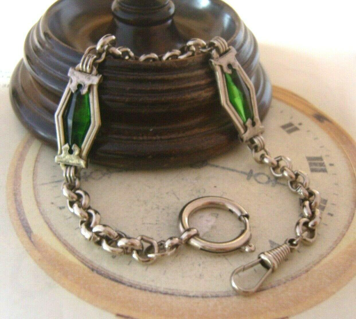 Antique Pocket Watch Chain 1910 Art Nouveau Chrome & Vivid Green Glass Albert