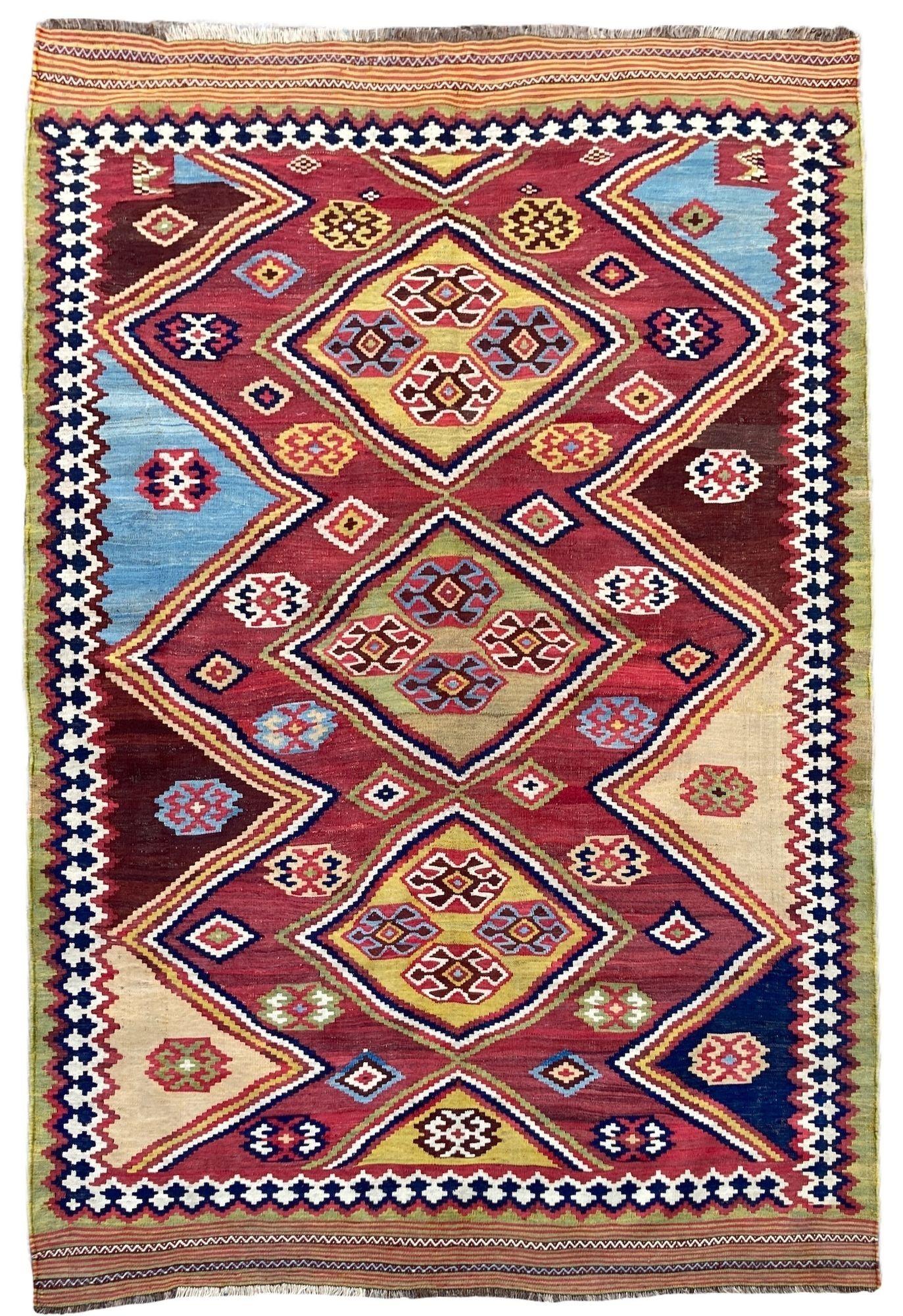 An exceptional antique Qashqai kilim, woven by the eponymous nomadic tribe circa 1890. This kilim features a geometrical 3 medallion design on a terracotta field. An unusually small size with fabulous natural colours and a highly collectible and decorative piece. Size: 2.02m x 1.37m (6ft 8in x 4ft 6in) This kilim is in very good condition with light, age-related wear. Fringes and selvedges are original and secure and it has been professionally cleaned. Free worldwide shipping.