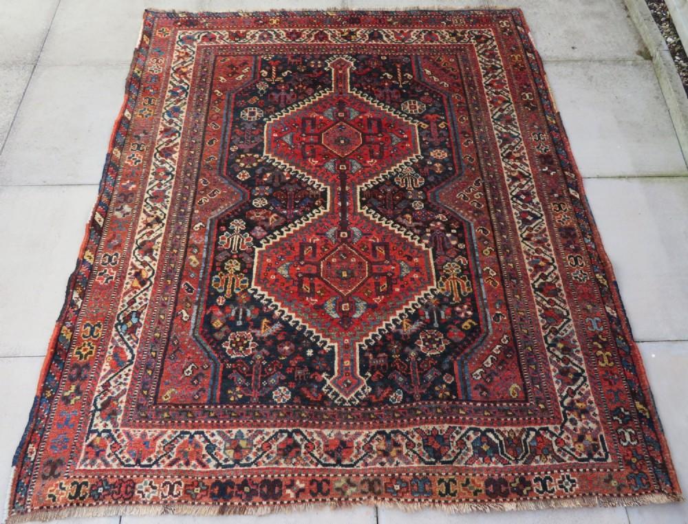 Antique Qashqai Tribal Rug with Animals & Birds - Twin Pole Medallions with Qashqai Emblems Inside