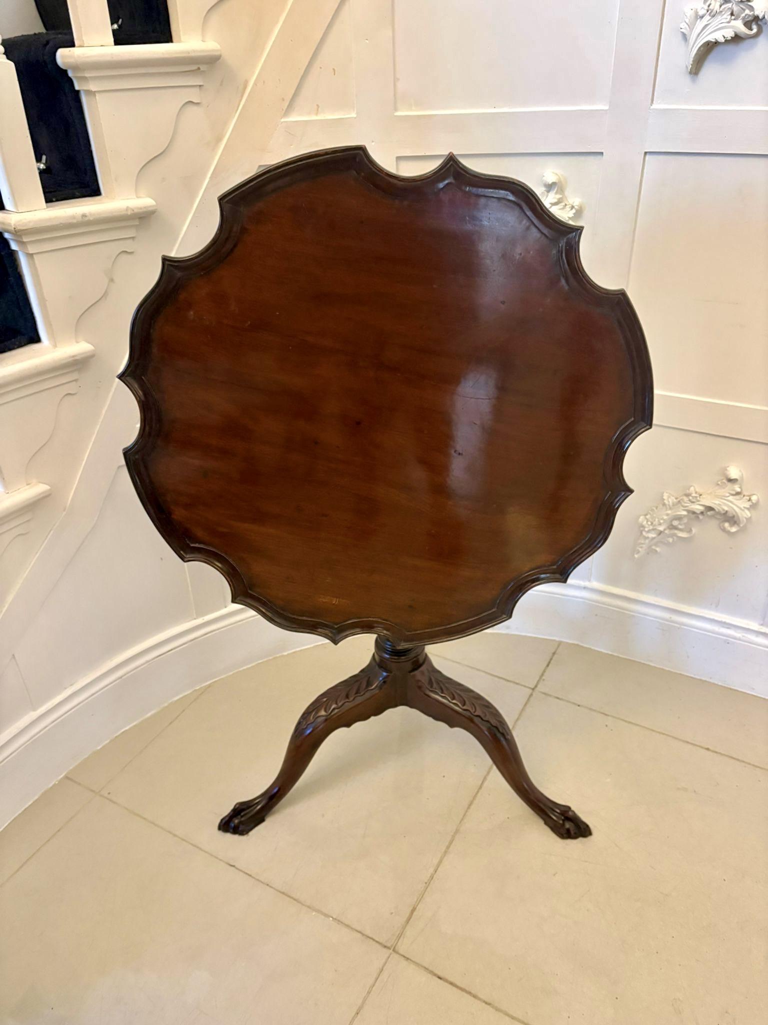 A well-proportioned Antique George III mahogany centre table, standing on a finely carved tripod base with elegant cabriole legs terminating in bold claw feet. The circular top is attractively shaped with a scalloped outline and a subtle moulded edge, lending both movement and refinement to the design. The mahogany displays a rich, warm tone with an appealing patina, highlighting the quality of the timber and the confident late 18th-century craftsmanship. Of practical and versatile scale, this table is well suited for use as a centre table, lamp table, or occasional table, fitting comfortably into both classic and contemporary interiors. Condition In very good antique condition. The table is solid and stable throughout, with no structural issues. The top shows light surface marks and gentle colour variation consistent with age and use, all of which add to its authenticity and character. Date: George III period 1800 Origin: English