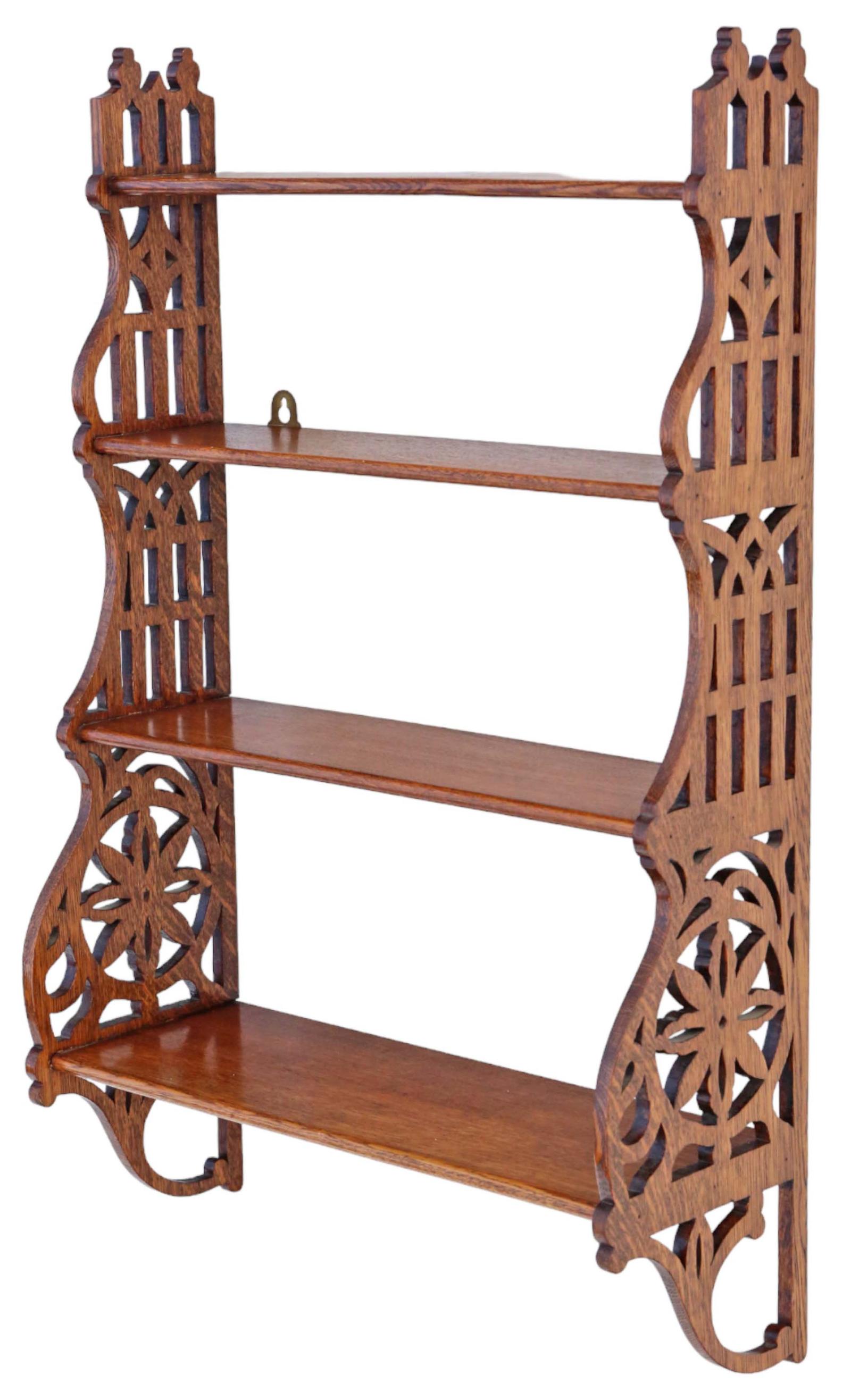 Antique Quality Victorian Gothic Fret Cut Oak Bookcase Wall Shelves c.1900 (1 of 5)