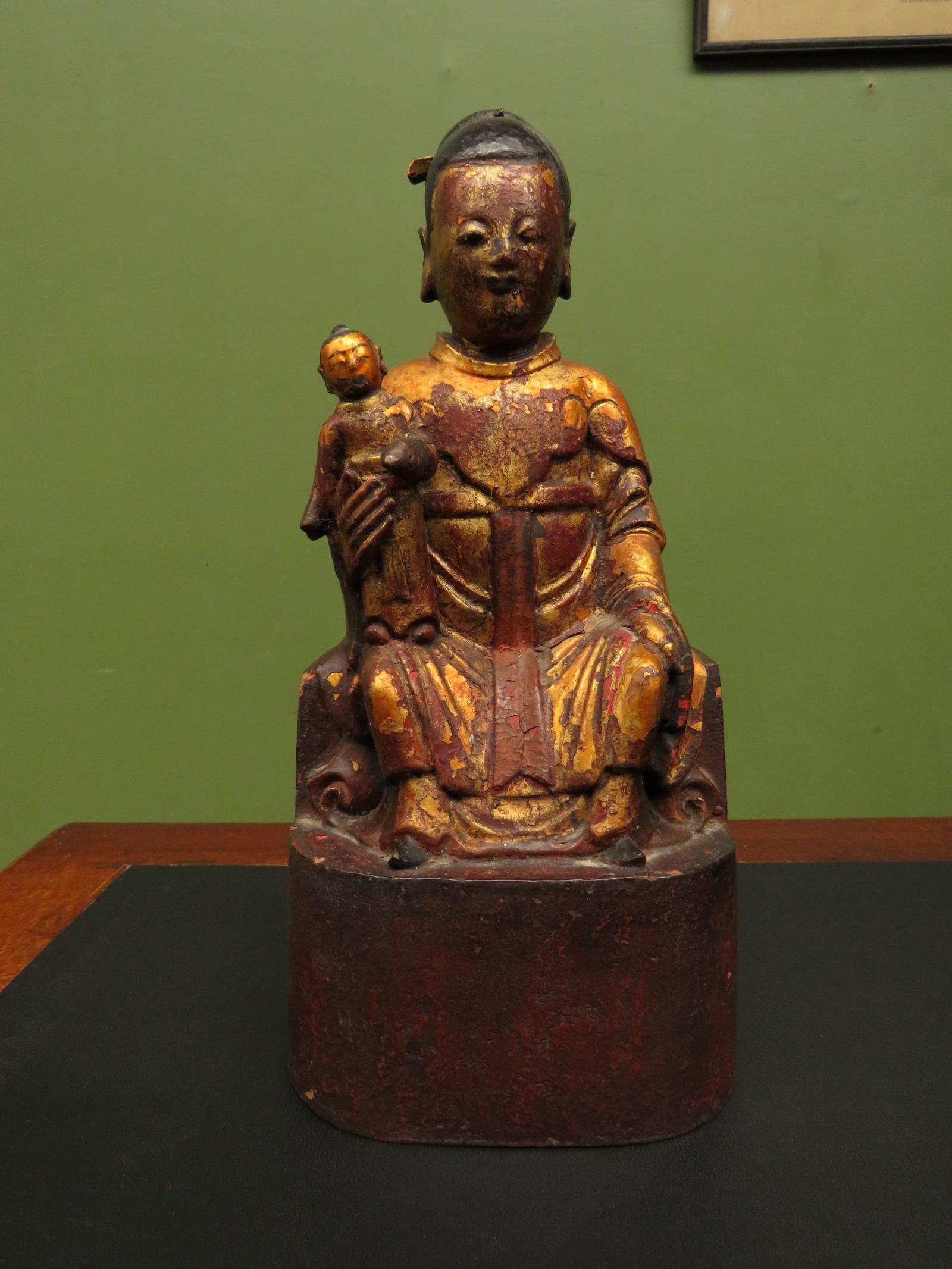 Antique Red & Gold Carved Wood Deity Guanyin with Child, Temple Figurine