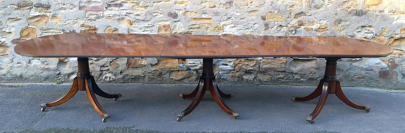 Antique Regency Style Mahogany Triple Pedestal Dining Table - Seats 14