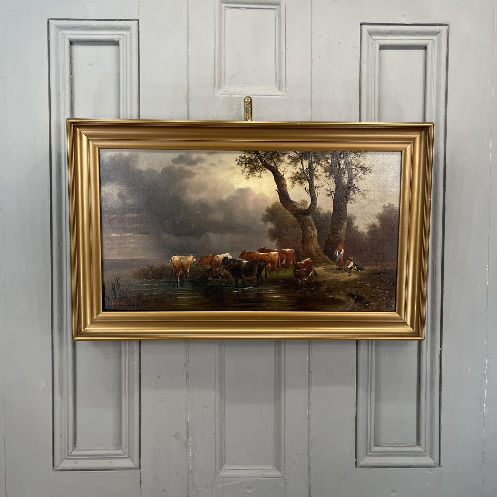Antique River Landscape Oil Painting of Cattle in the Shallows by Lefevre (2 of 2) (1 of 10)