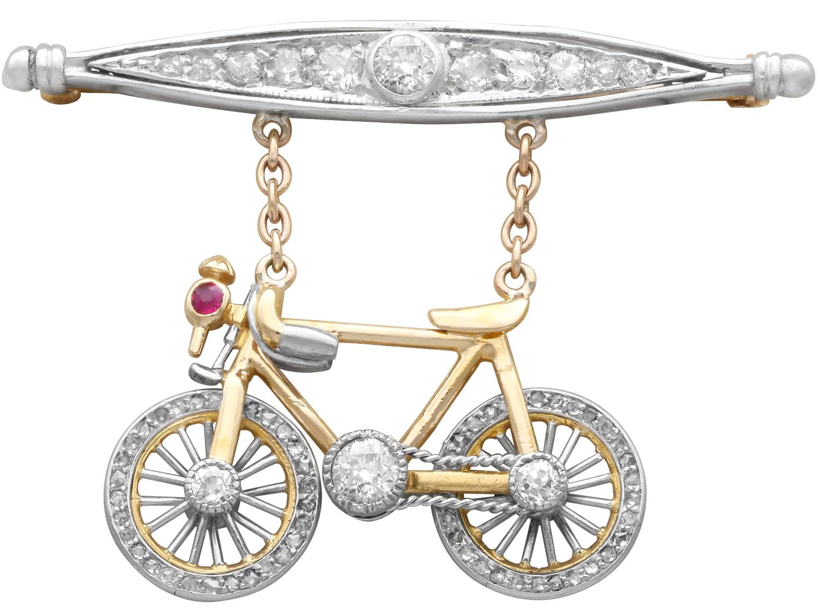A stunning, fine and impressive rare antique 0.04 carat ruby, 1.63 carat diamond, 9 and 14 karat yellow gold, platinum and silver set bicycle brooch; part of our diverse antique jewelry collections.
