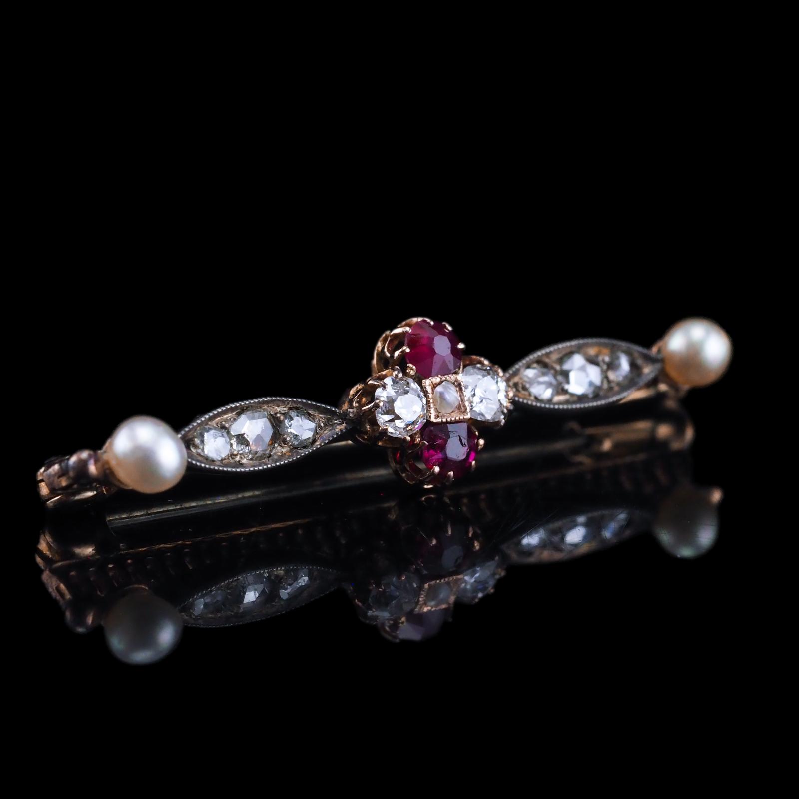 Antique Ruby & Diamond Brooch 14ct Gold with Pearl Accents c.1900