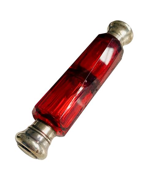 Antique Ruby Red Glass Double Ended Perfume Scent Bottle Sterling Silver Lids c.1880