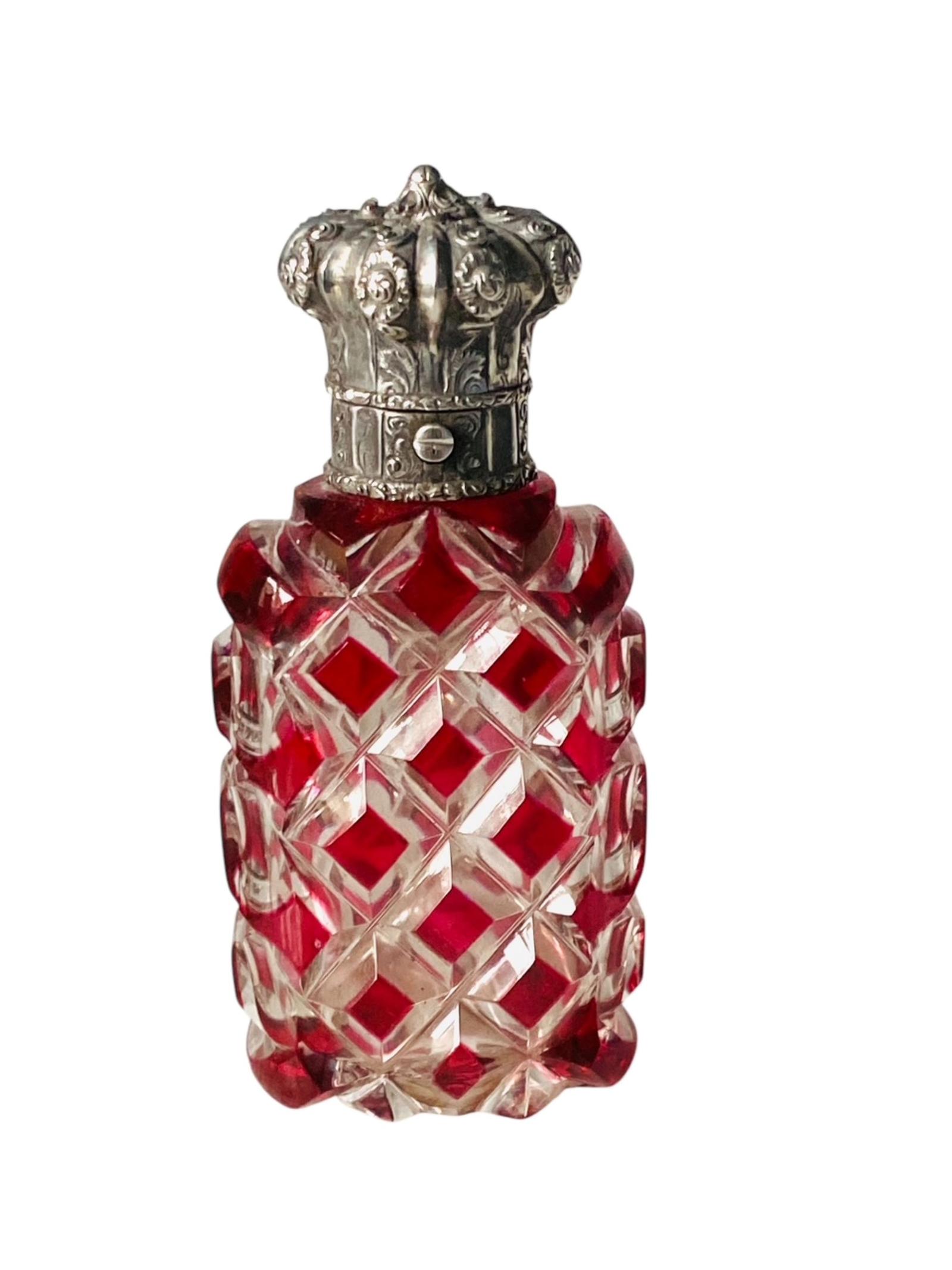 Antique Ruby Red Overlay Perfume Scent Bottle Large Sterling Silver Lid c.1880