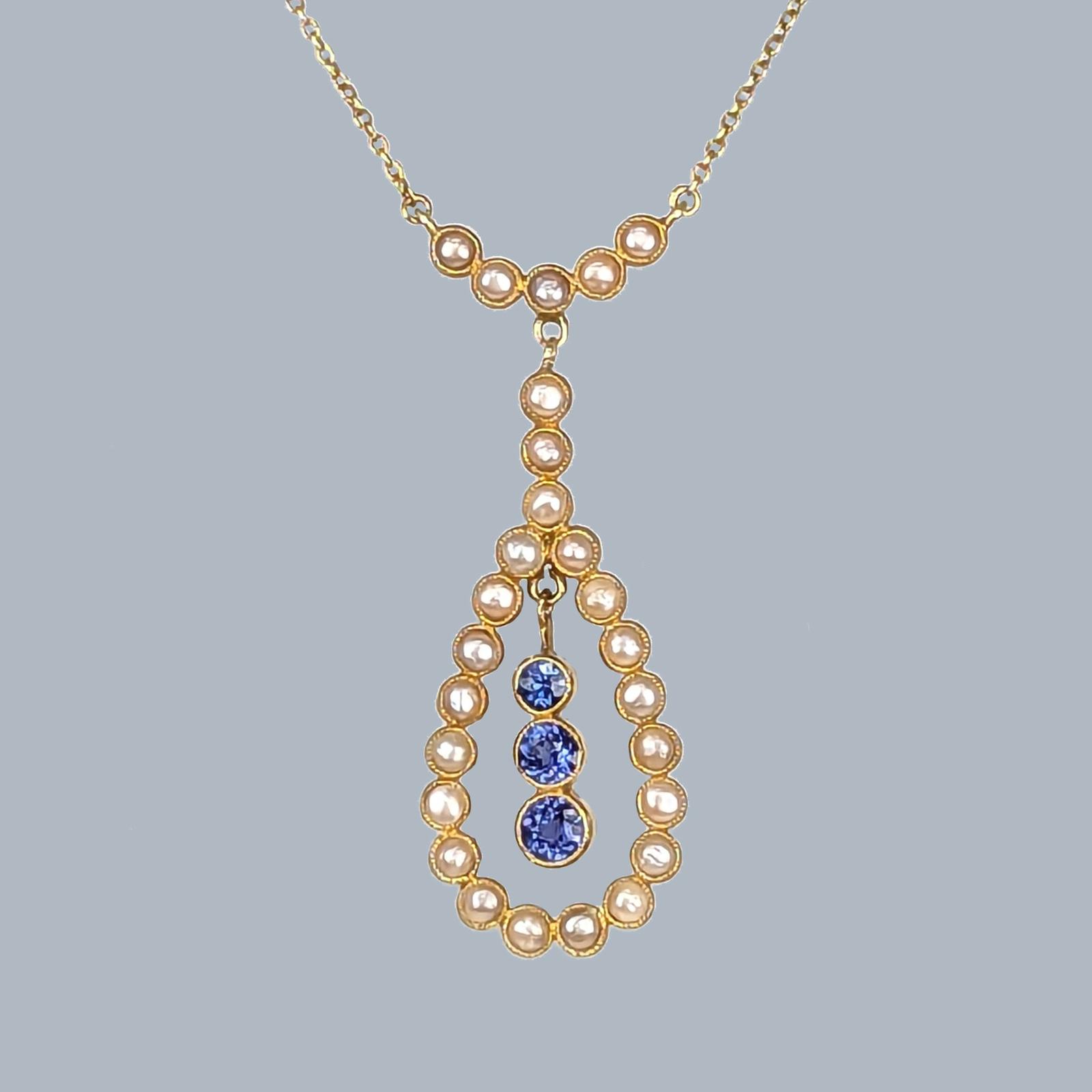 Antique Sapphire and Pearl Necklace 15ct Gold Edwardian Sapphire Drop Pendant
