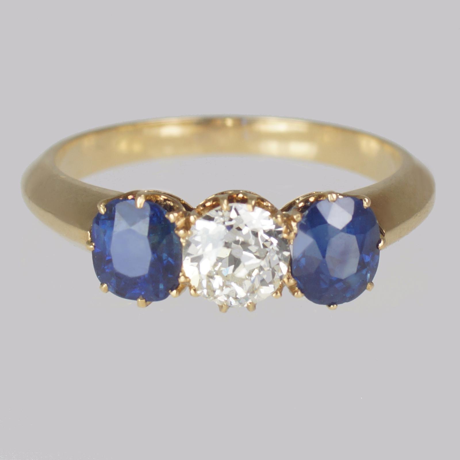 Antique Sapphire & Diamond Trilogy Ring Victorian 18ct Gold Old Cut Diamond Ring