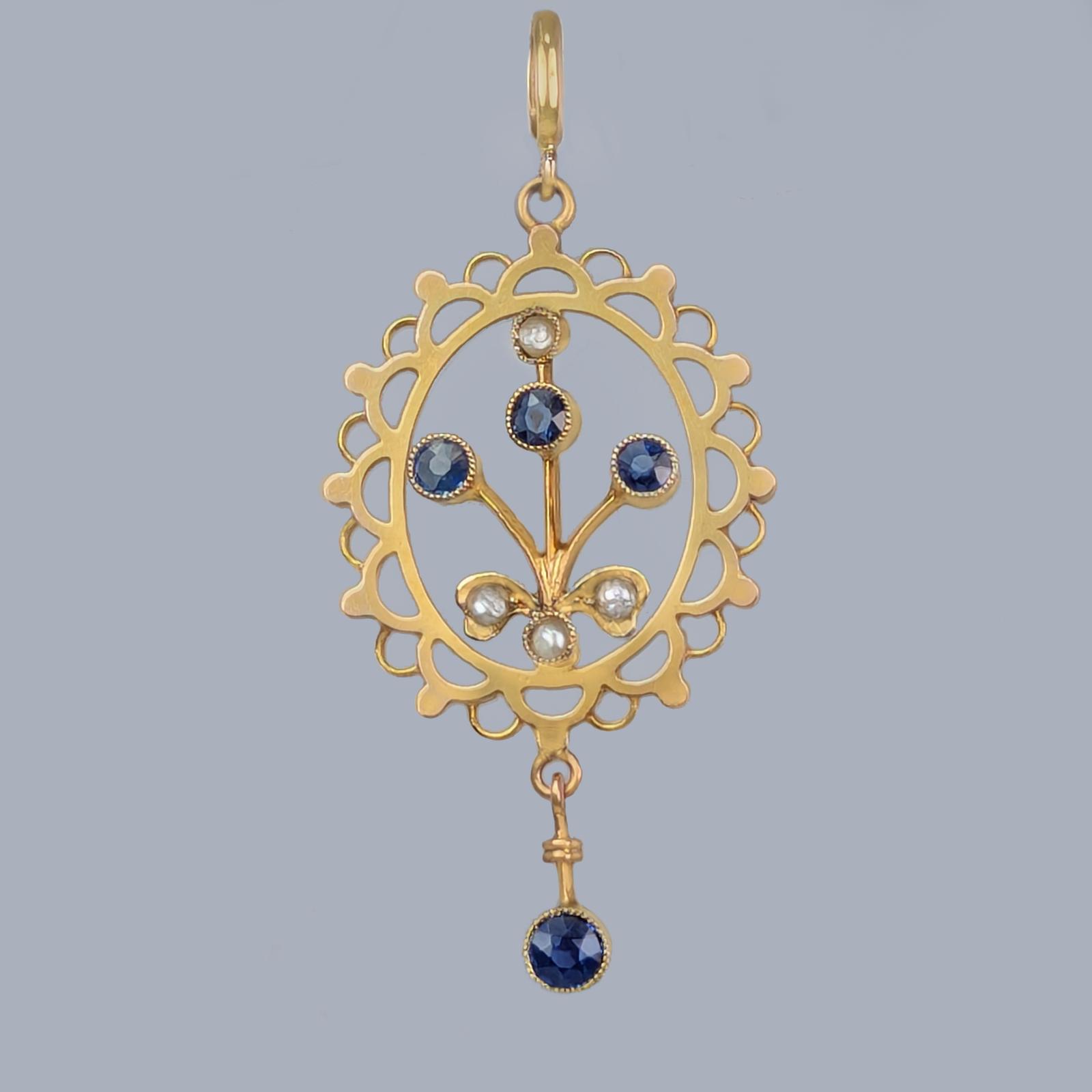 Antique Sapphire & Pearl Pendant 9ct Gold Edwardian Drop Floral Pendant c.1910