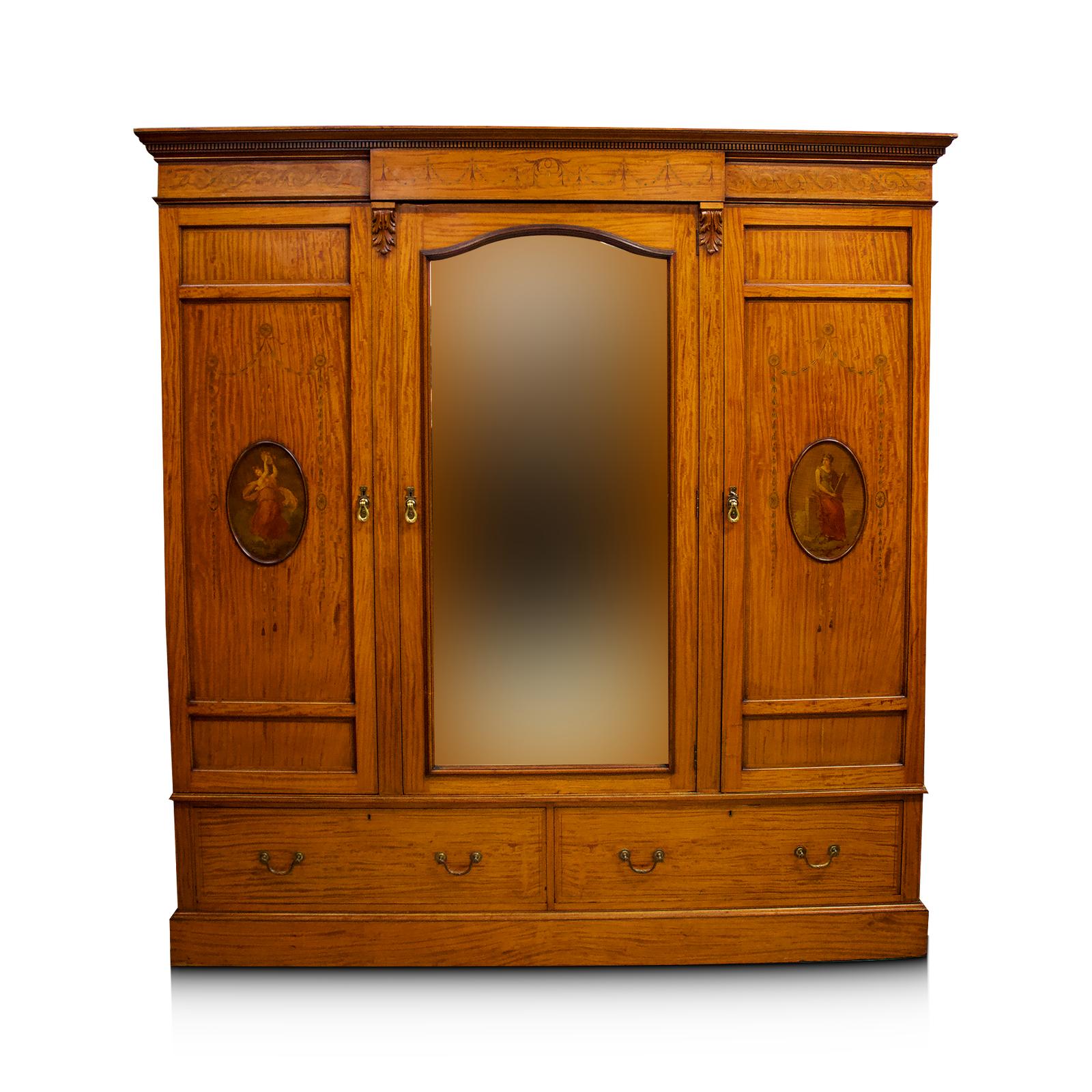Antique Satinwood Inlaid Three Door Wardrobe with Painted Panels