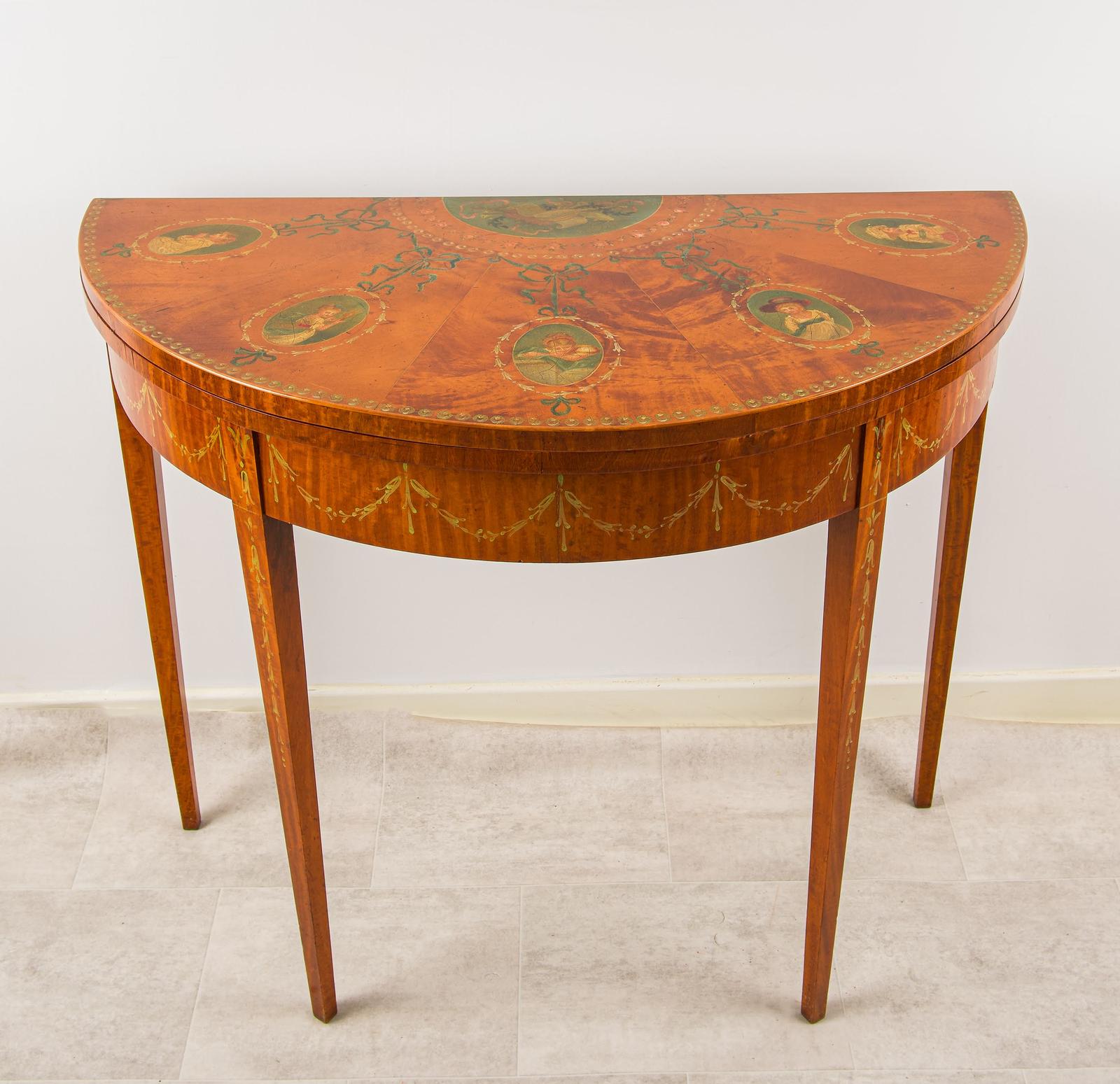 Antique satinwood demi-lune games table dating to around 1900. Decorated throughout with hand-painted classical motifs and oval portrait panels. The hinged top opens to reveal its original baize playing surface. Raised on tapering legs and in very good condition for its age. A decorative and functional antique table.