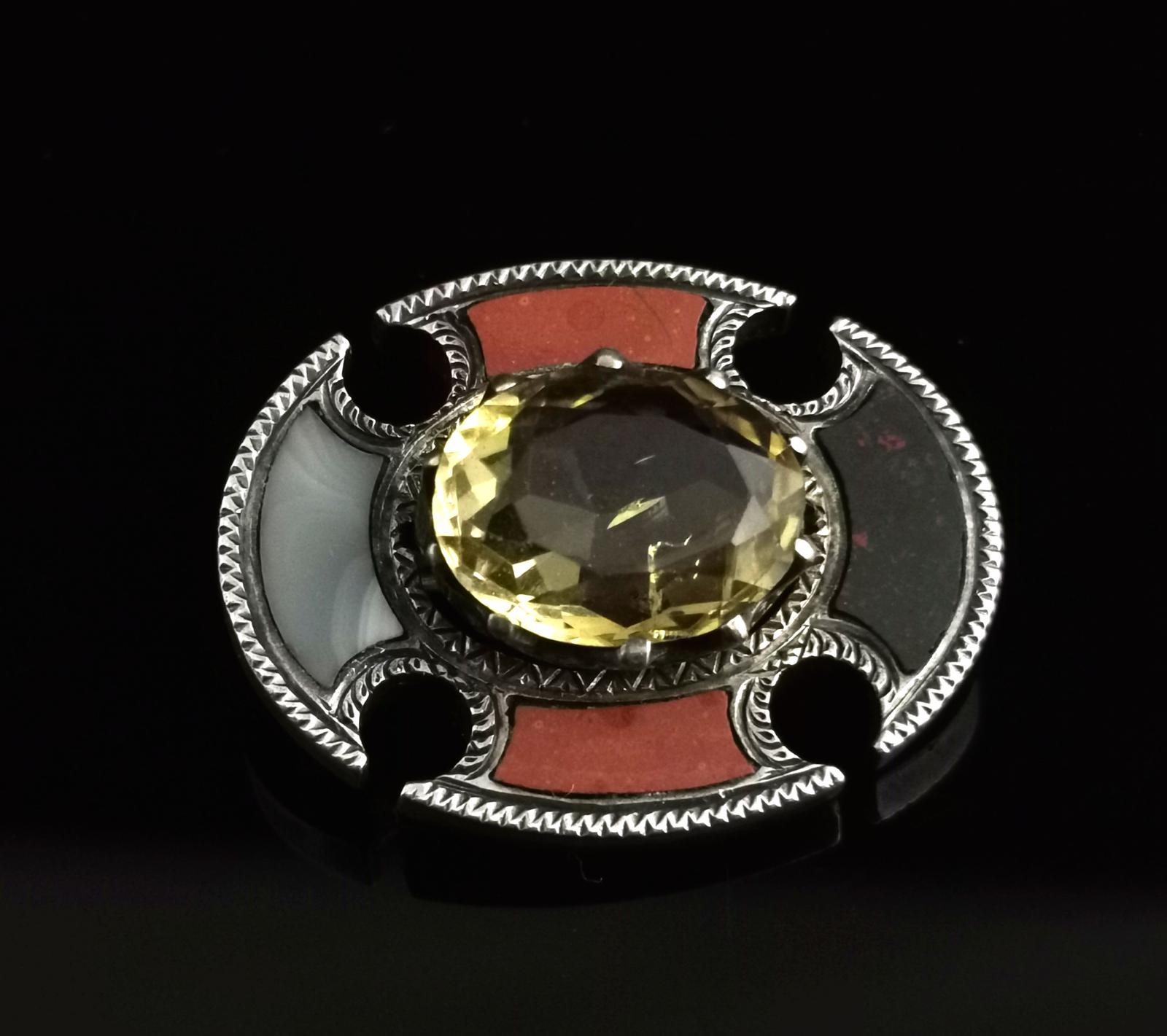 Antique Scottish Agate and Citrine Brooch, Sterling Silver