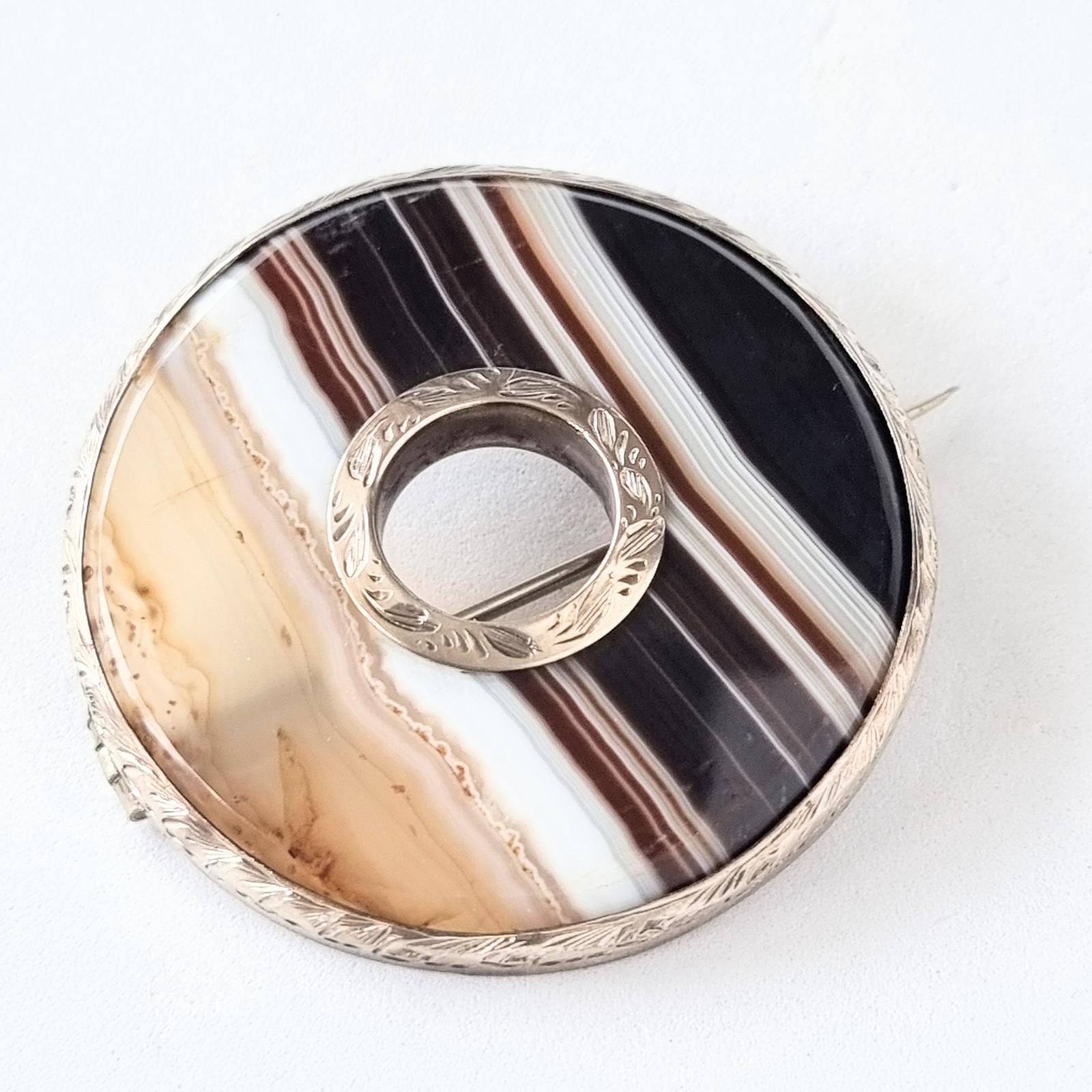 Antique Scottish Circular Plaid Brooch, Banded Agate, Inner & Outer Silver Rim