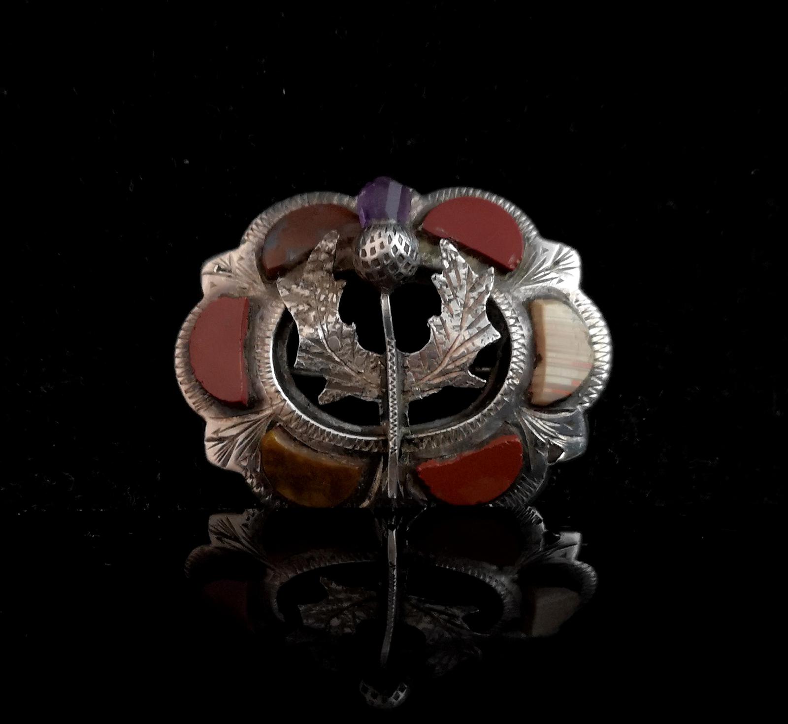 Antique Scottish silver and agate brooch, Amethyst thistle