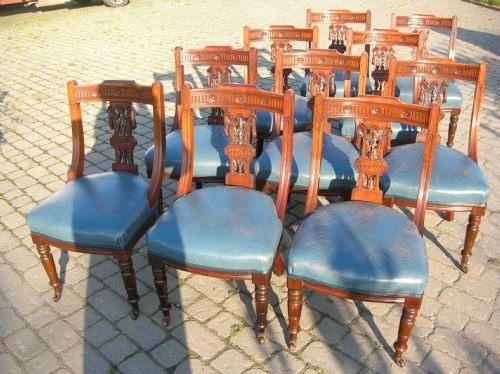 Antique Set of 12 Walnut 19th Century Spoon Back Leather Upholstered Dining Chairs