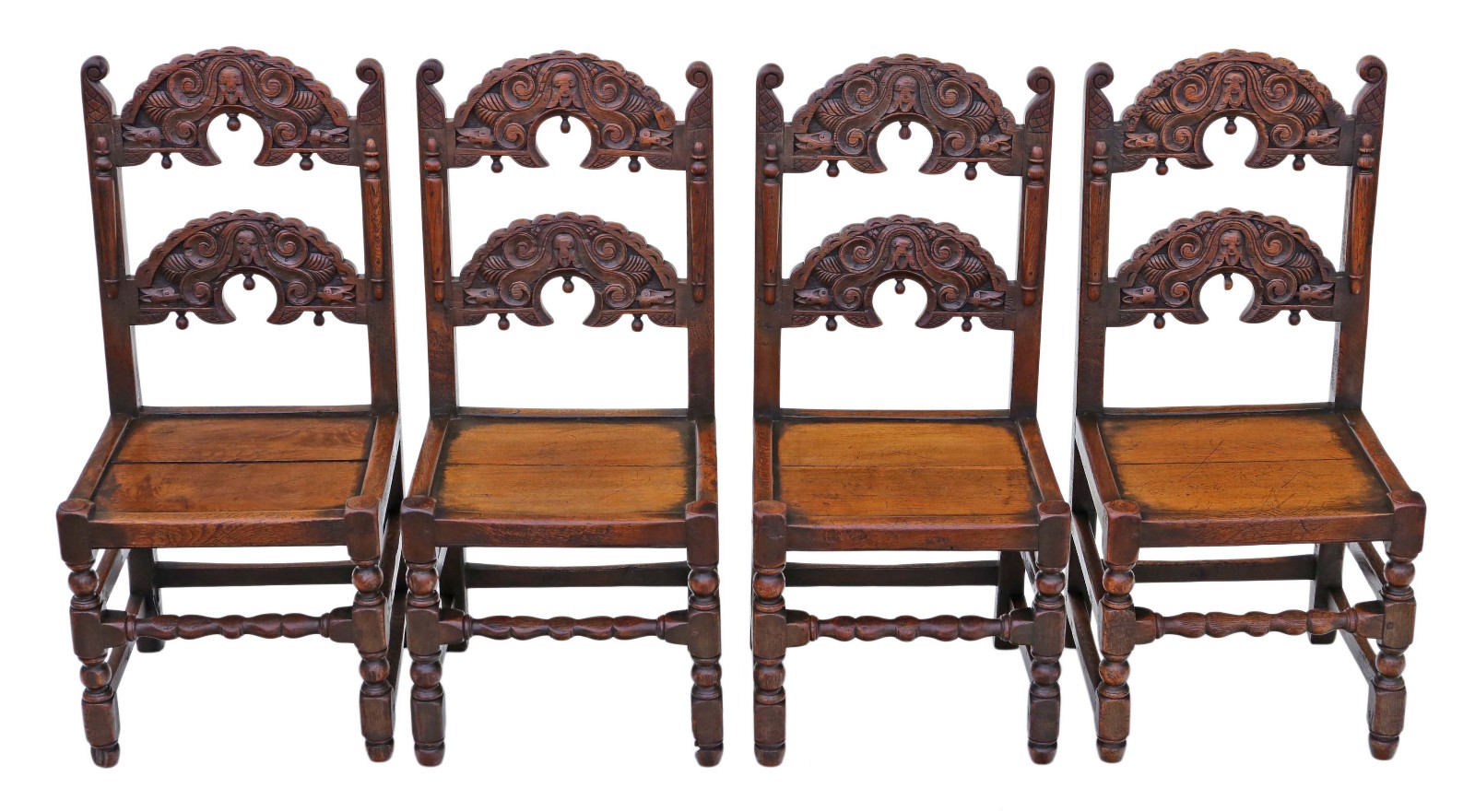 Antique Set of 4 19th Century Gothic Heavy Carved Oak Dining Chairs