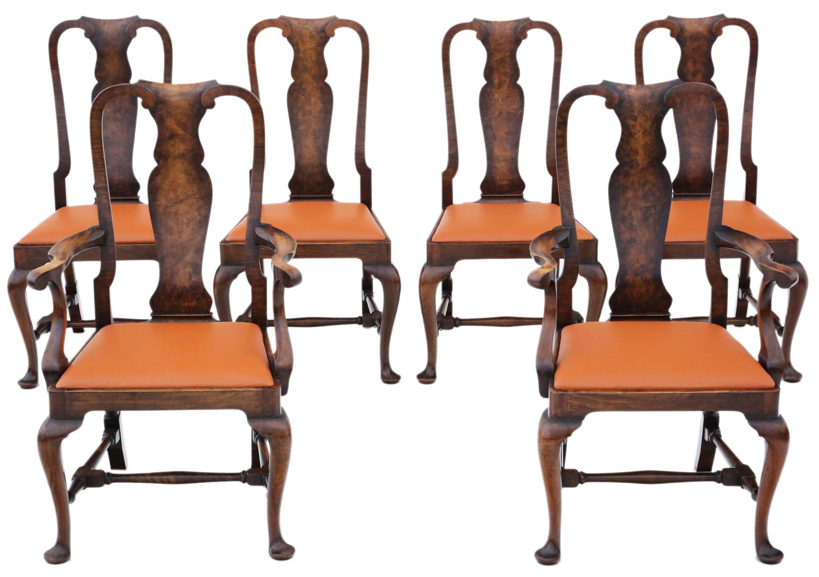 Antique Set of 6 Queen Anne Revival Burr Walnut Dining Chairs c.1910 - Exceptional Quality