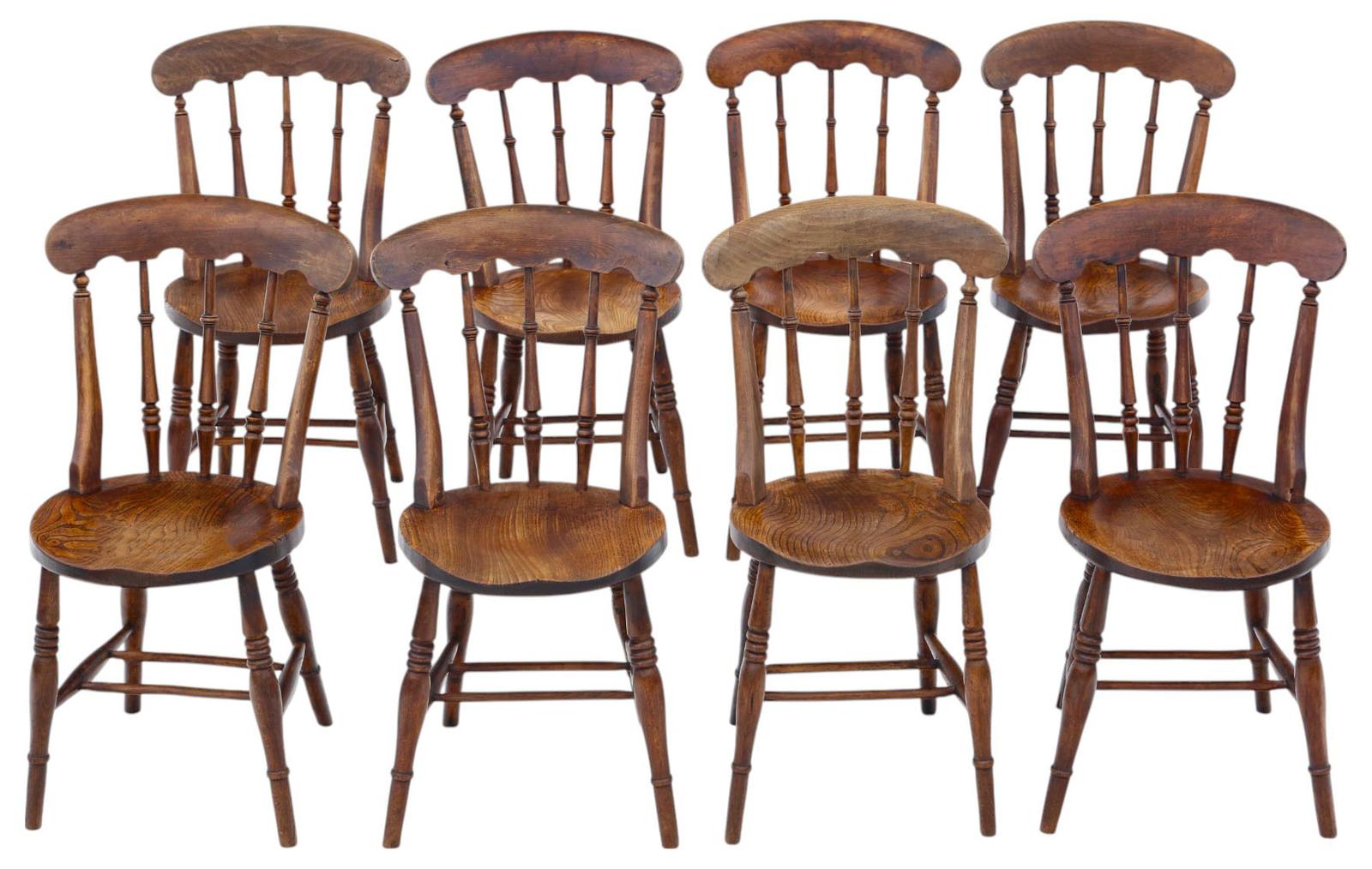 Antique Set of 8 Victorian Elm & Beech Kitchen Dining Chairs – 19th Century, Quality Originals