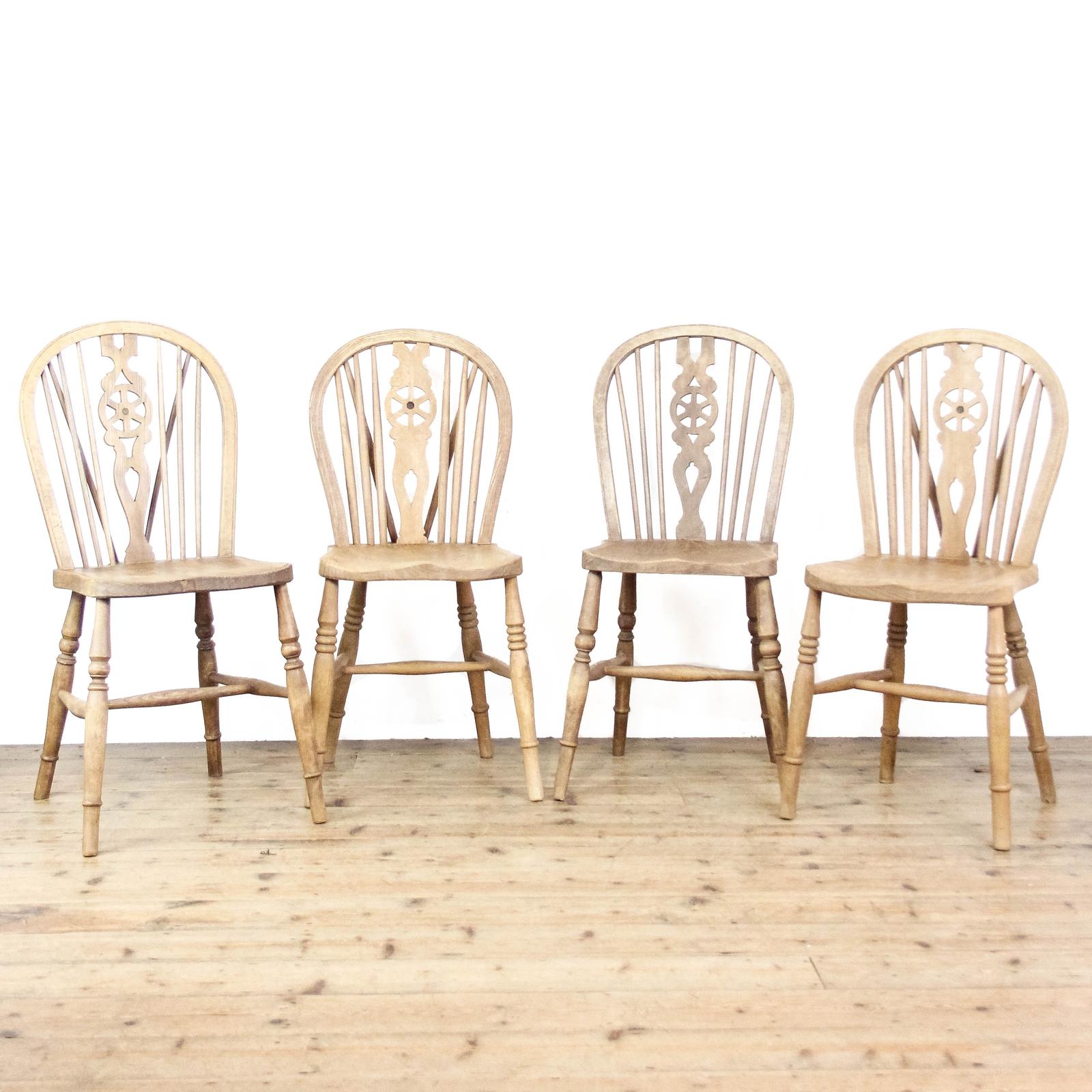 An attractive set of four near matching antique pine wheelback kitchen chairs. The antique kitchen chairs all have hoop and stick backrests, with a decorative fret cut wheel shaped central splat. The antique kitchen chairs are raised on four turned legs with ‘H’ stretcher supports. A particularly pleasing set, with wonderful colour and grain throughout. Item Reference: M-6410