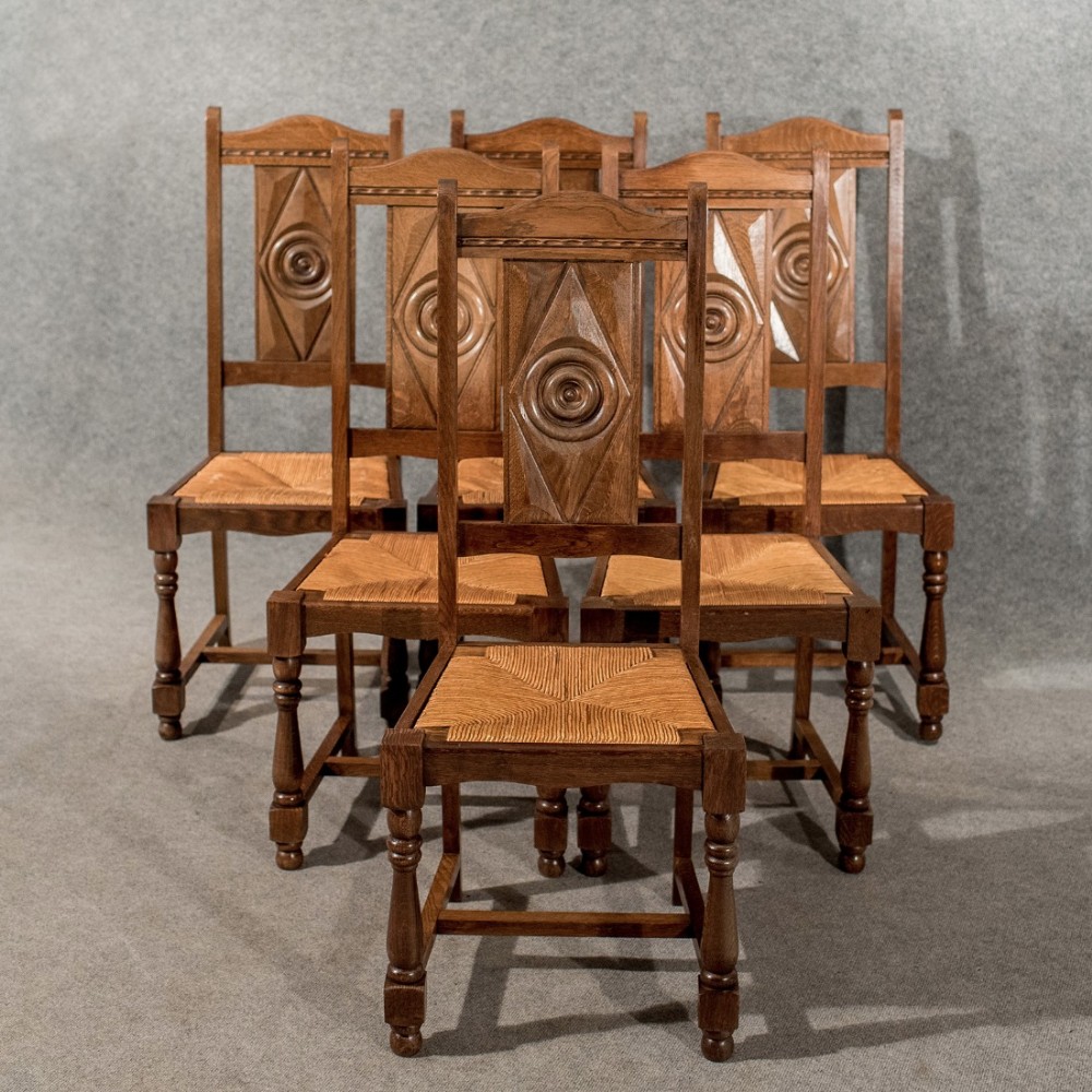 Antique Set of Oak 6 Six Country Dining Kitchen Chairs Rush Seated Edwardian c.1910