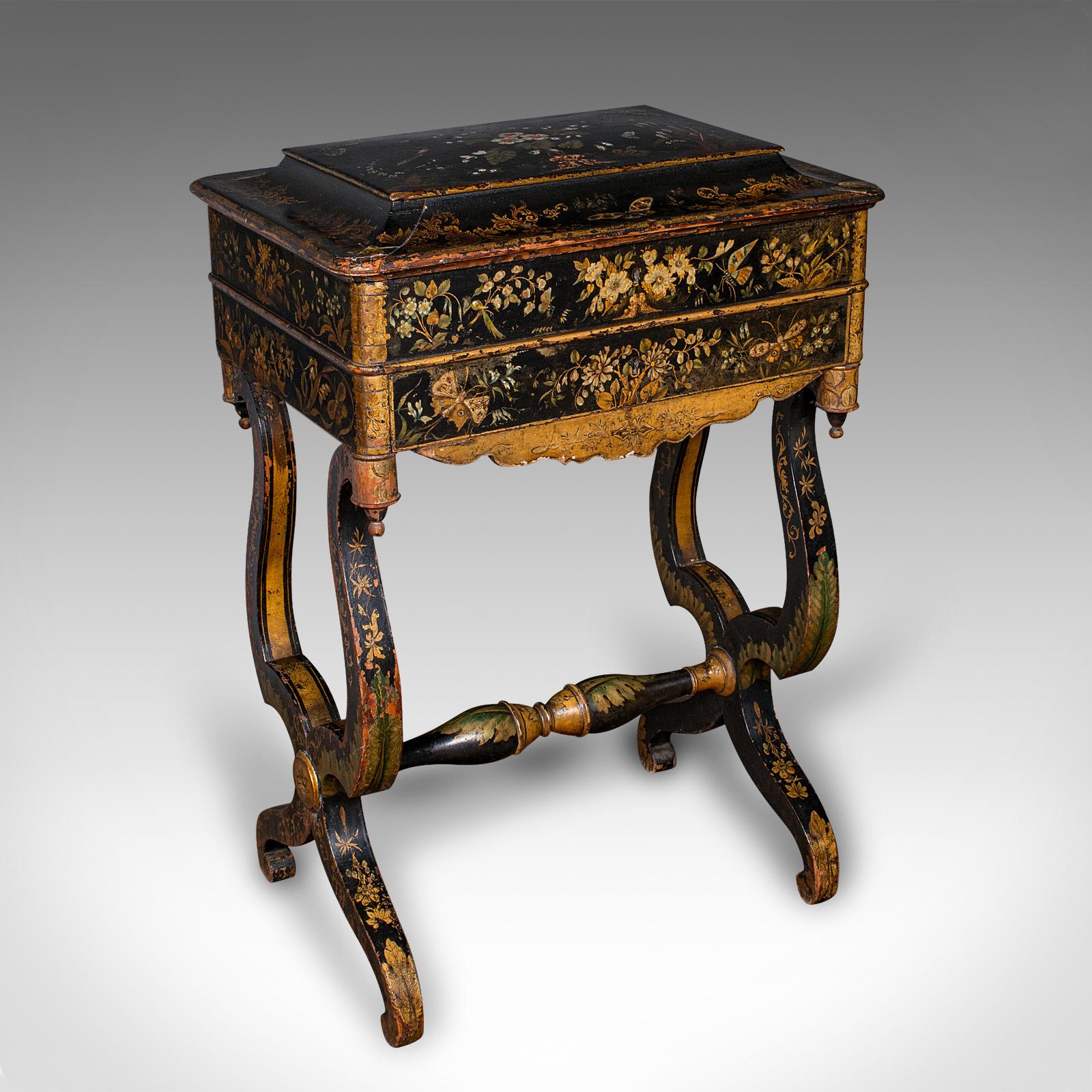 Antique Sewing Table, English, Lacquered, Handpainted, Japanned - Victorian c.1880