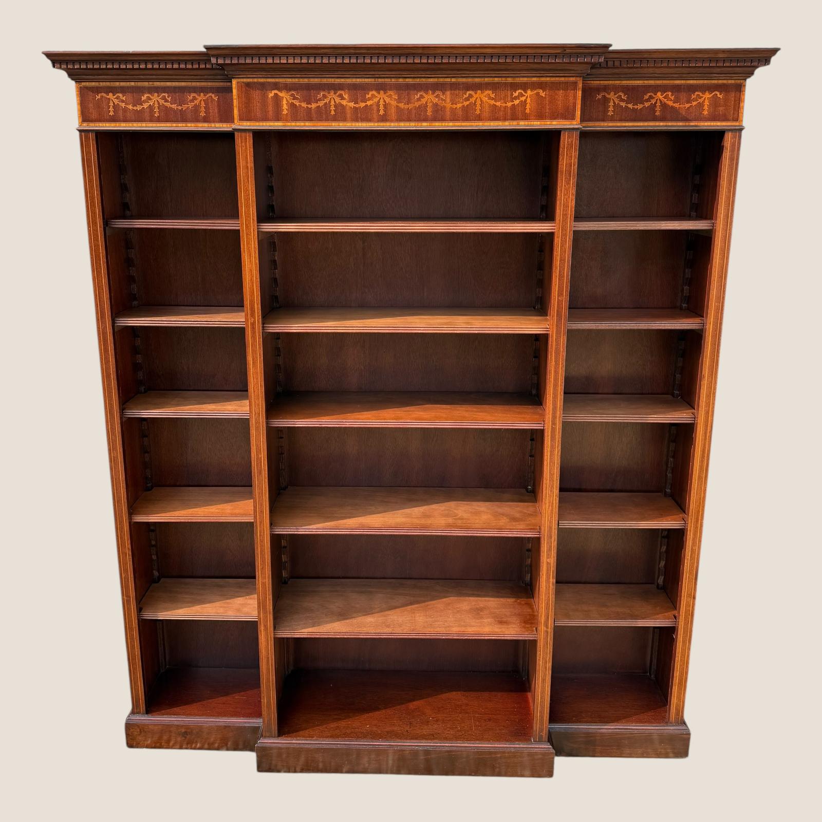 Antique Sheraton Style Mahogany Inlaid Breakfront Open Bookcase with Shelves