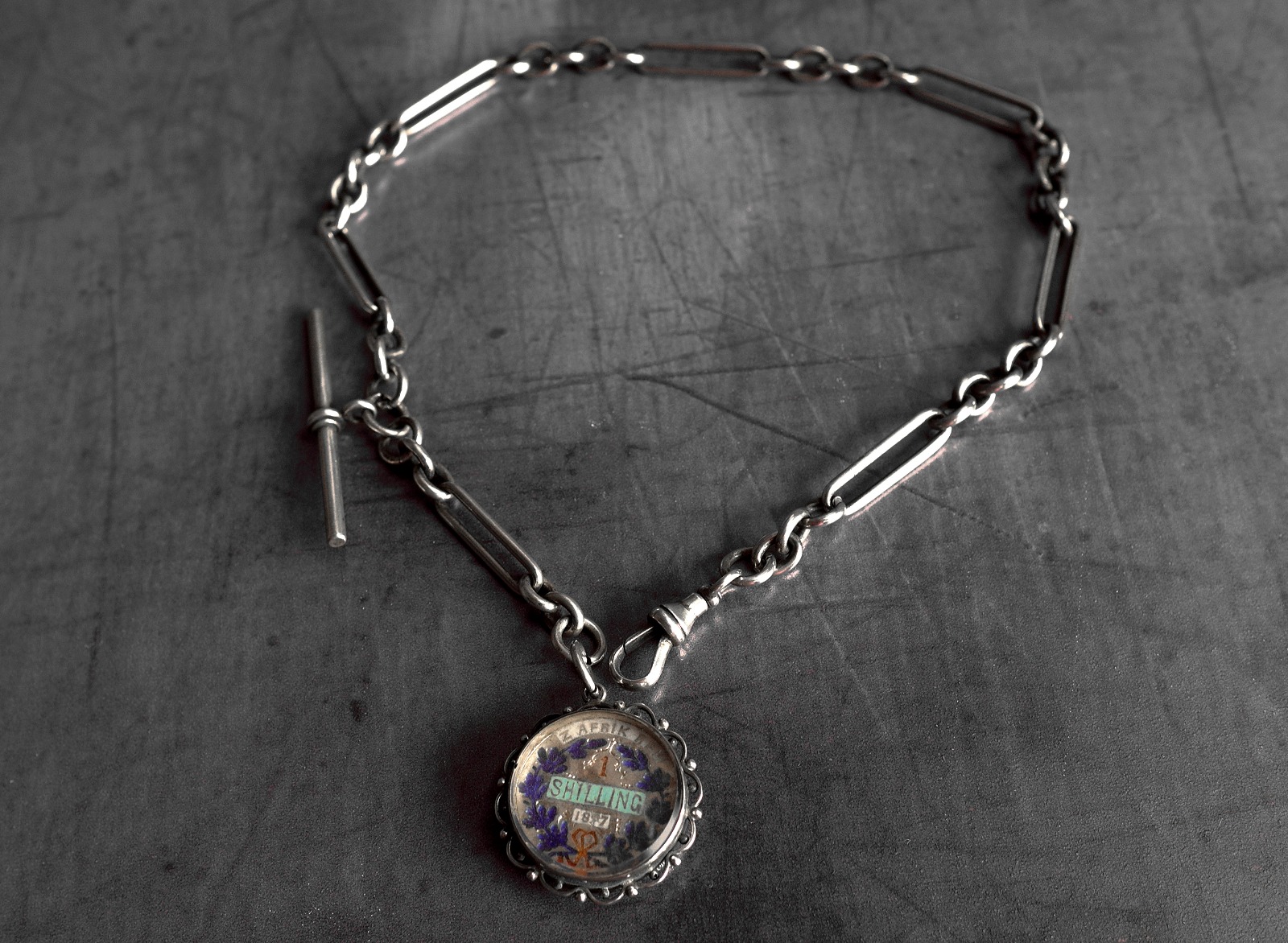 Antique Silver Albert Watch Chain and Enameled 1897 South African Shilling Fob in Silver Mount, 15 Inch