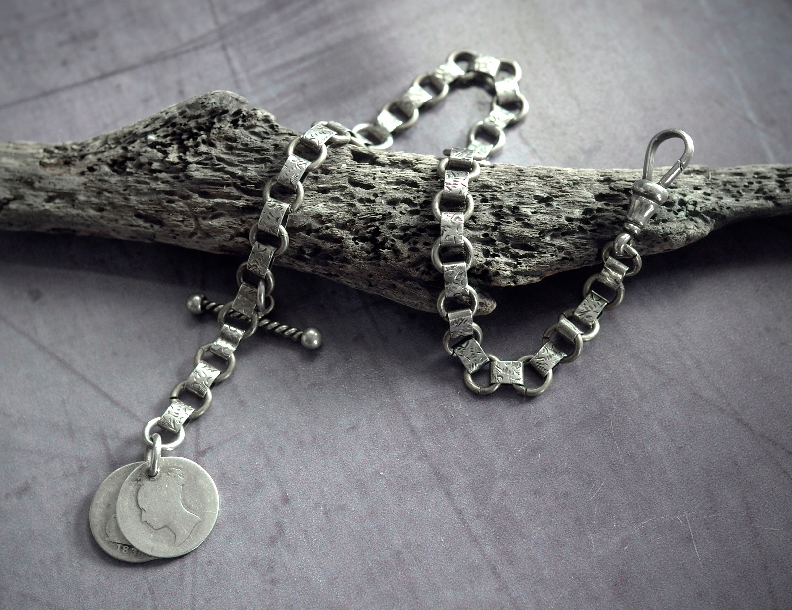 Antique Silver Albertina Chain with Silver Fourpence Coin Charms, Victorian