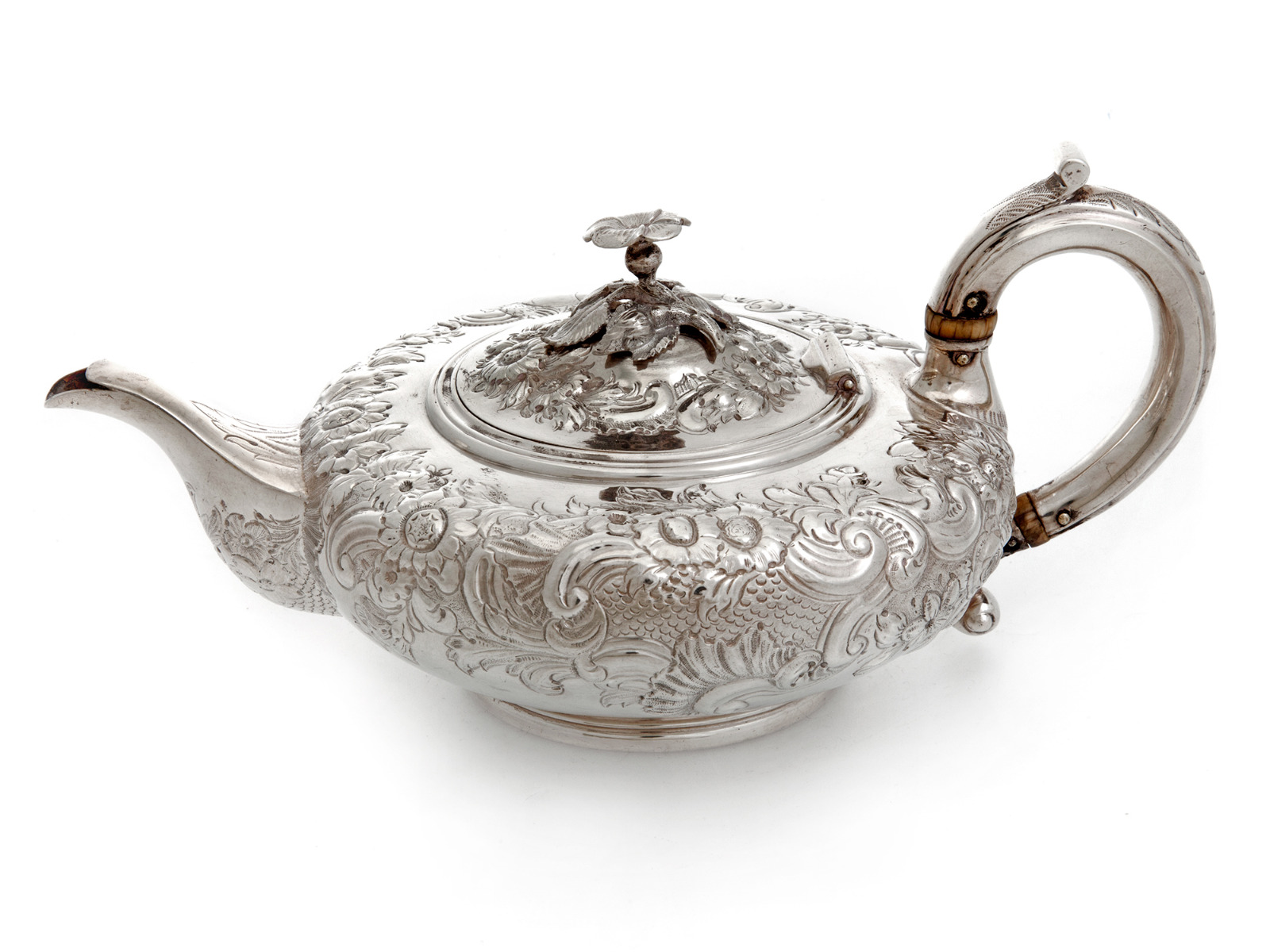 Antique Silver Bachelor Tea Pot Highly Decorated with Scrolls & Flowers