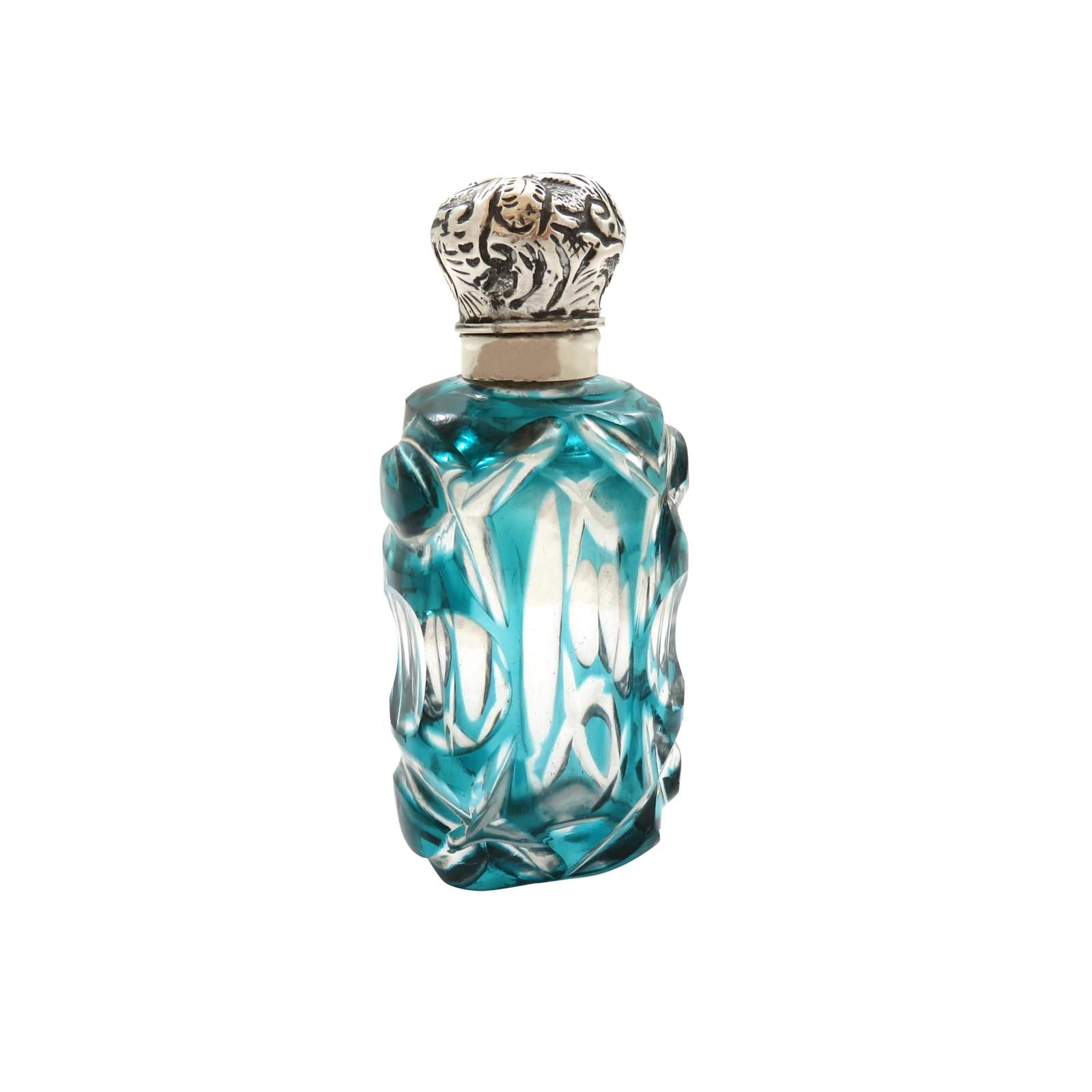 Antique Silver & Blue Overlay Cut Glass Scent / Perfume Bottle c.1890