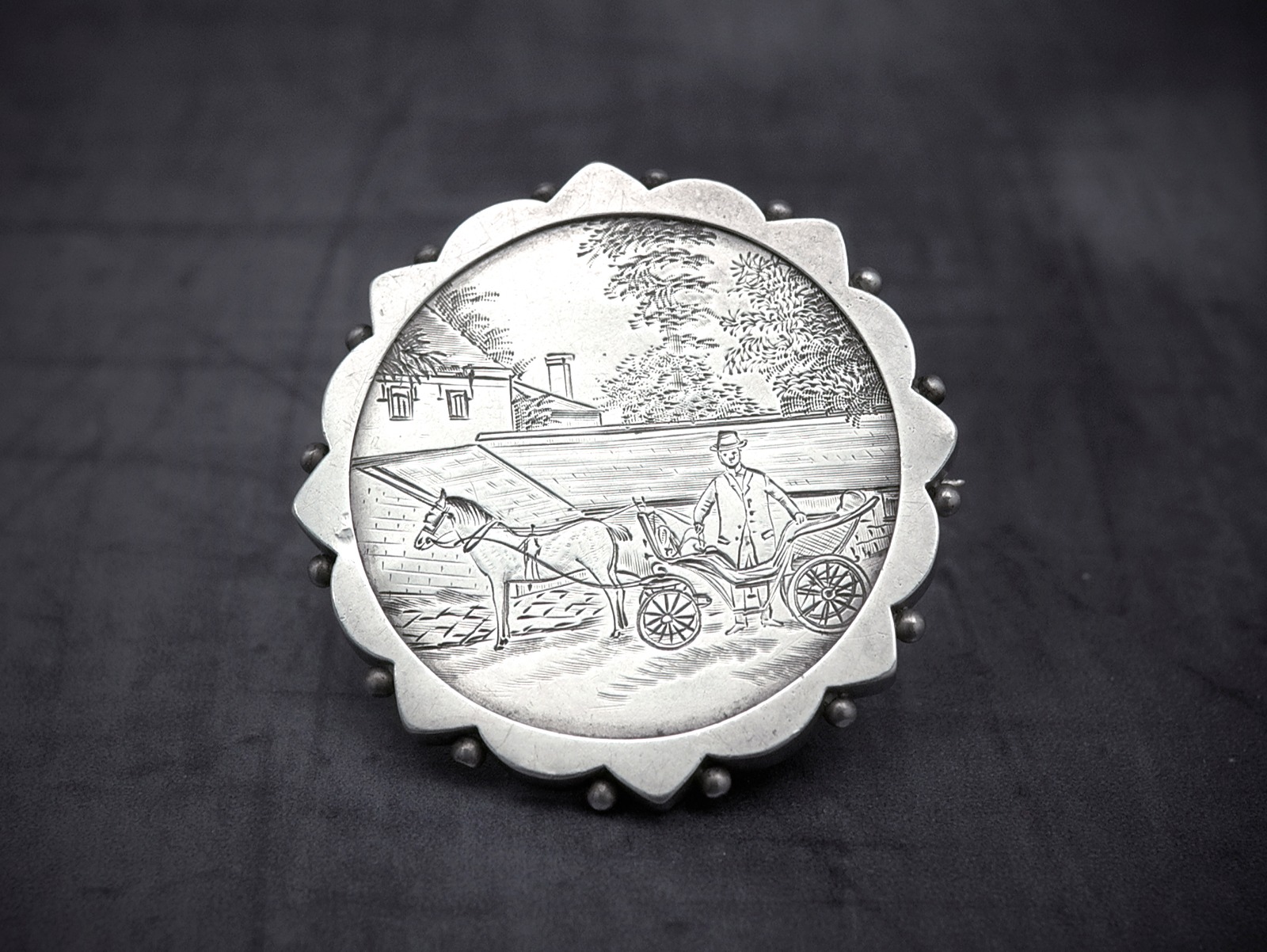 Antique Silver Brooch or Pendant, Gentleman with Horse & Carriage, Victorian 1880s, Aesthetic Movement Picture Pin