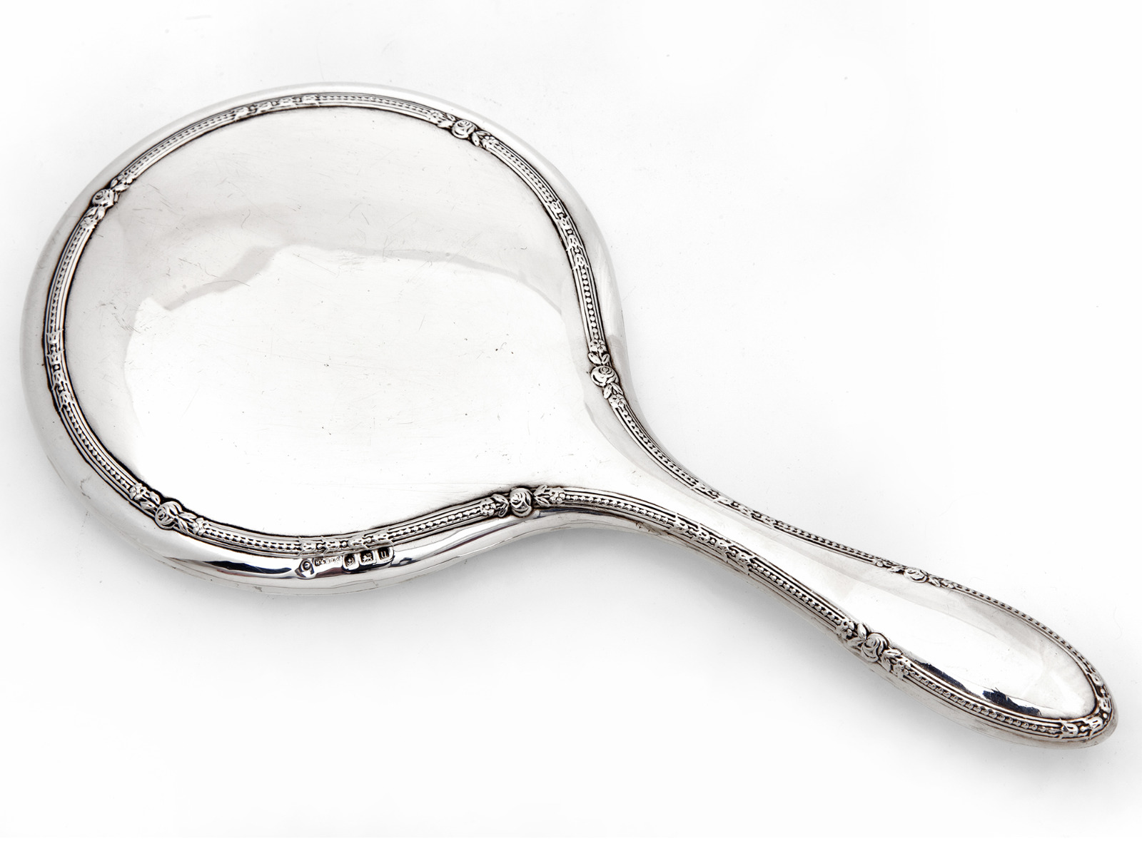 Antique Silver Circular Hand Mirror with a Delicate Floral Border (1 of 1)