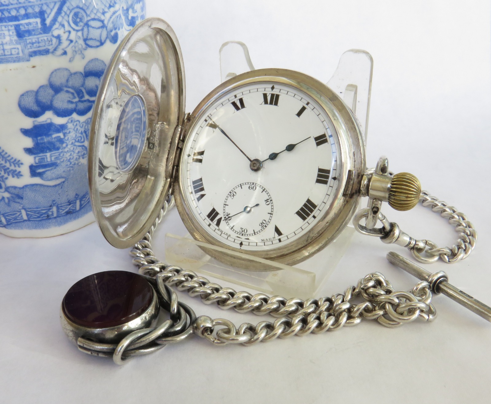 Antique Silver Cyma Half Hunter Pocket Watch & Chain