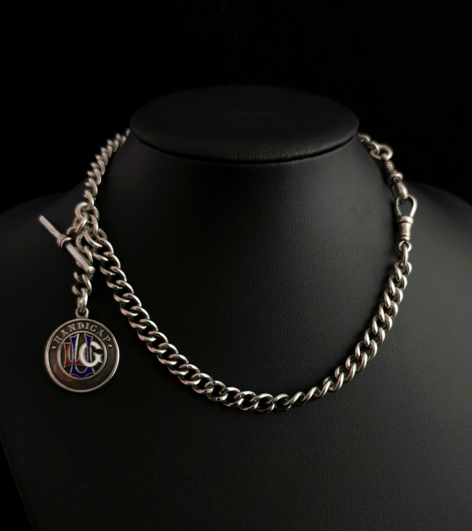 Antique Silver Double Albert Chain, Enamelled Silver Fob, Watch Chain