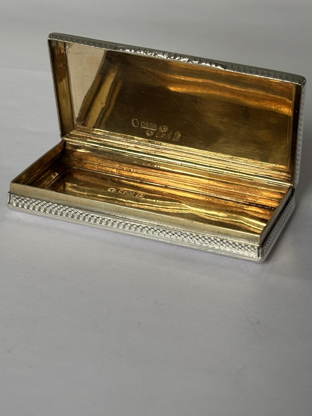 A stunning early Victorian sterling silver snuff box case by Nathaniel Mills Birmingham 1838. Beautifully engine turned on both sides, the hinged cover opens to reveal a beautifully gilt interior. Two vacant central cartouches, one on each side. In very good antique condition overall, the hallmarks are very good, gilding still bright. A top quality piece by one of the best makers. Usual signs of wear all commensurate of age and use.
