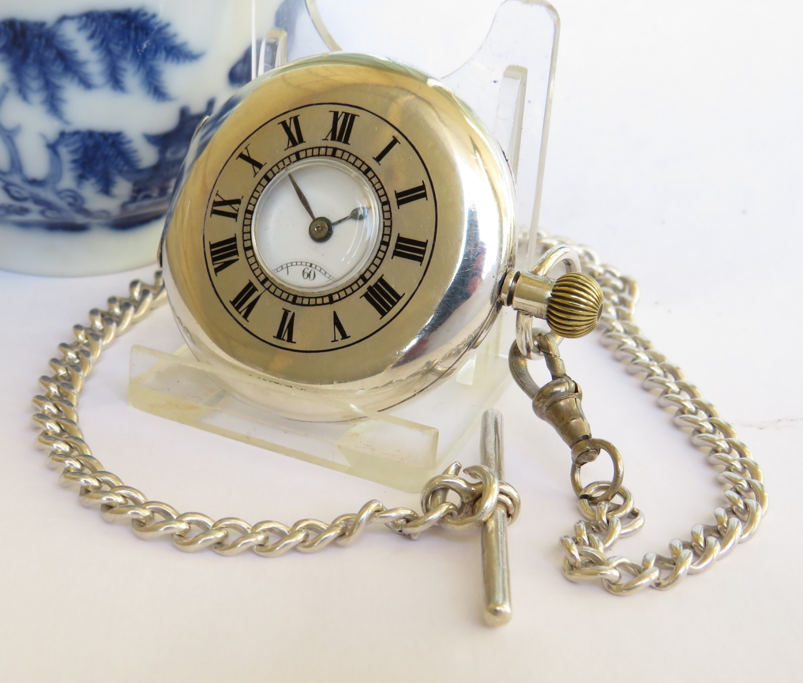 Antique Silver Electa Half Hunter Pocket Watch & Chain