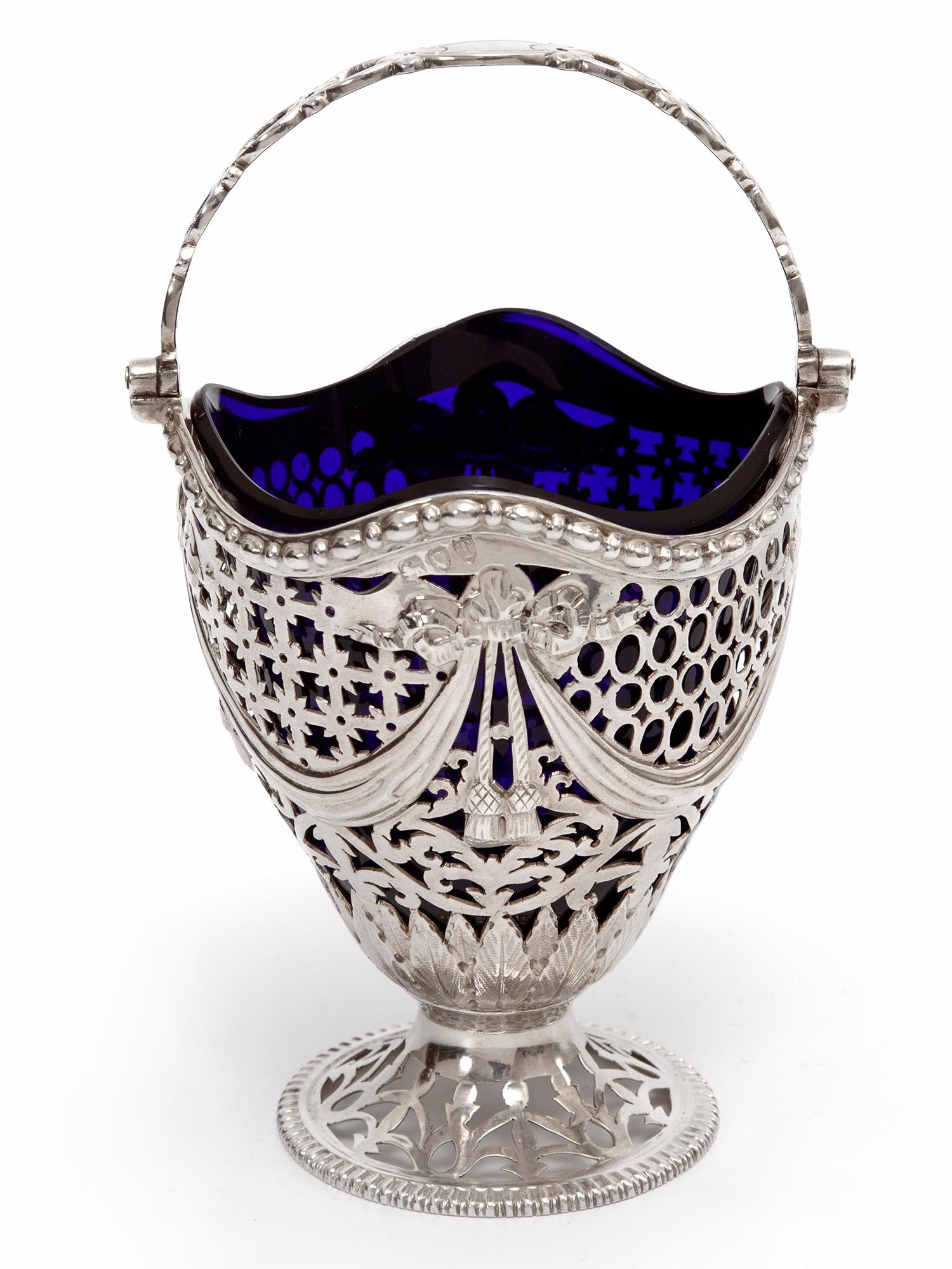 Antique Silver George III Style Sugar Basket with a Bristol Blue Liner