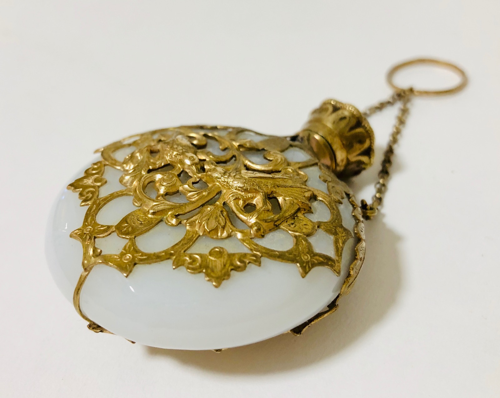 Antique Silver Gilt Opaque Glass Scent Bottle Chatelaine