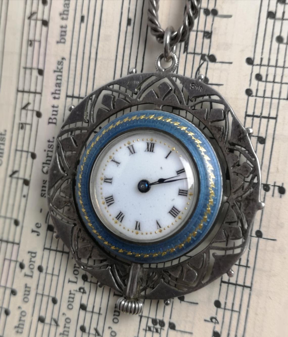 Antique Silver & Guilloche Enamel Fob Watch, Marcasite Pendant