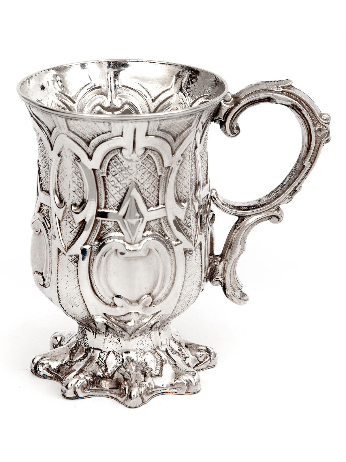 Antique Silver Plated Christening Mug constructed from four embossed panels