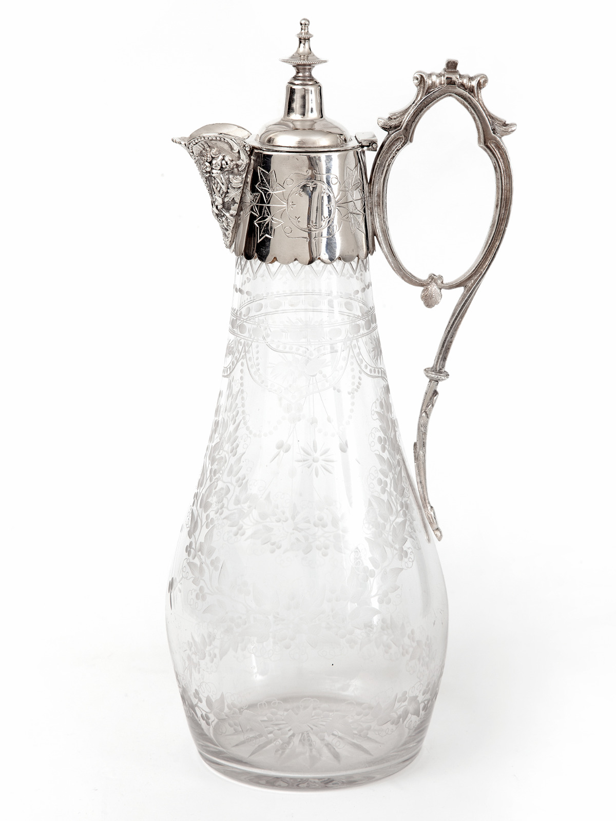 Antique Silver Plated Claret Jug with a Cast Floral Spout & Hand Engraved Glass Body