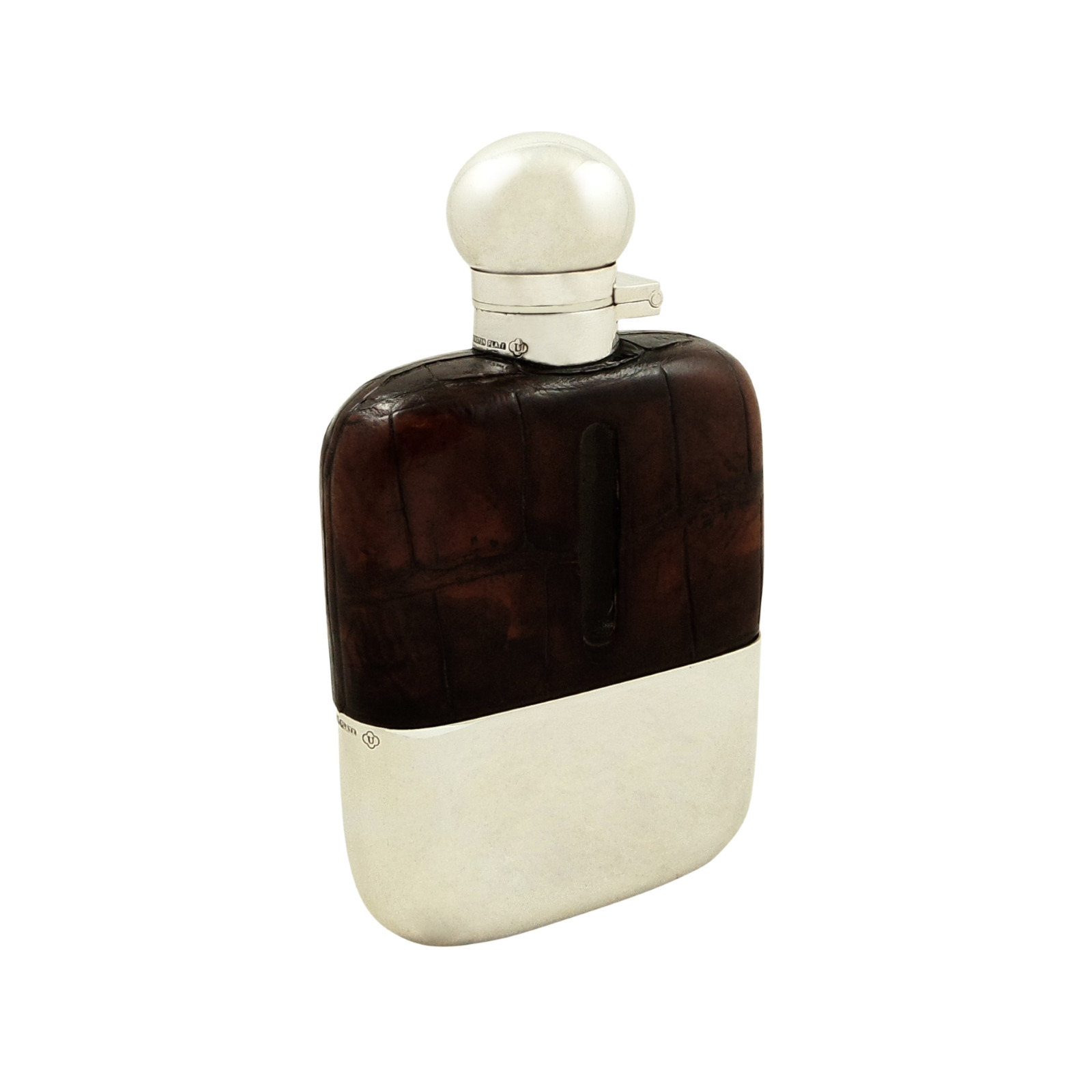 Antique Silver Plated & Crocodile Leather Hip Flask with Cup 1931