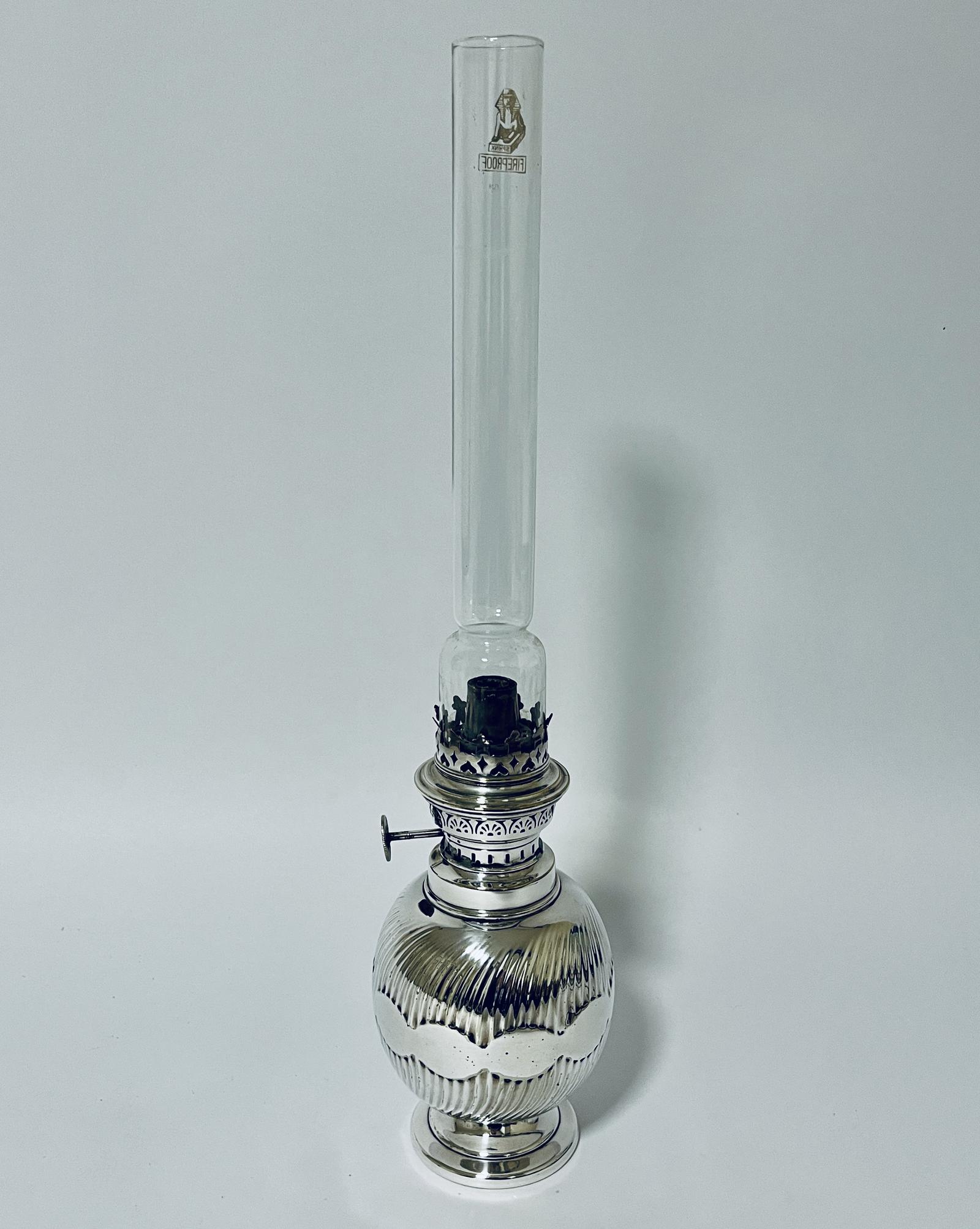 This Antique Silver Plated Oil Lamp by Mappin & Webb is located in Devon, United Kingdom